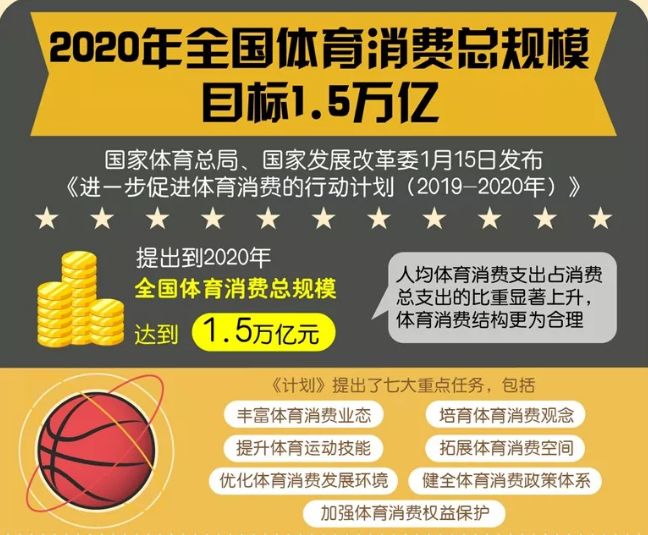 为进一步推进体育消费持续提质扩容,1月15日,国家体育总局联合国家发改委发布《进一步促进体育消费的行动计划(2019-2020年)》,提出丰富体育消费业态、培育体育消费观念、提升体育运动技能、拓展体育消费空间、优化体育消费发展环境、健全体育消费政策体系、加强体育消费权益保护。