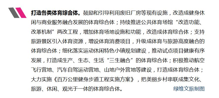 值得注意的是,《行动计划》针对拓展体育消费空间,提出“打造各类体育综合体”。鼓励废旧厂房改造成体育综合体,推进体育场馆两改后改造成体育综合体,支持景区升级成体育综合体,落实运动休闲特色小镇规划建设打造成体育综合体,推动航空飞行营地、汽车自驾运动营地、山地户外营地等建成体育综合体,大力实施《百万公里健身步道工程实施方案》把美丽乡村串联成集体育综合体。