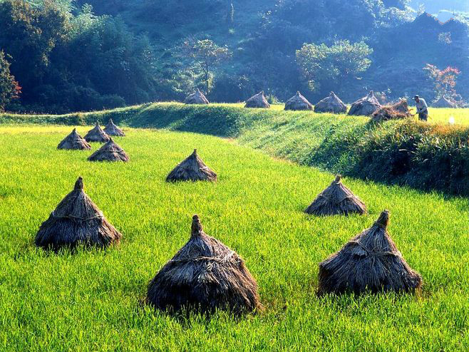 青森县田馆舍村艺术稻田。一个 2000多年水稻种植历史的古村,1993年为振兴农业,利用不同颜色、品种的水稻在15000平方米的田地上种出惊人的艺术作品;年游客量超过30万人次,带动了稻田艺术在日本各县的蔓延。每年4月艺术家设计图案,在不同区域做上记号,村民协作运用不同品种的稻子播种,5月开始稻田不断生长,图案逐渐显现,每年7月是最佳观赏季。