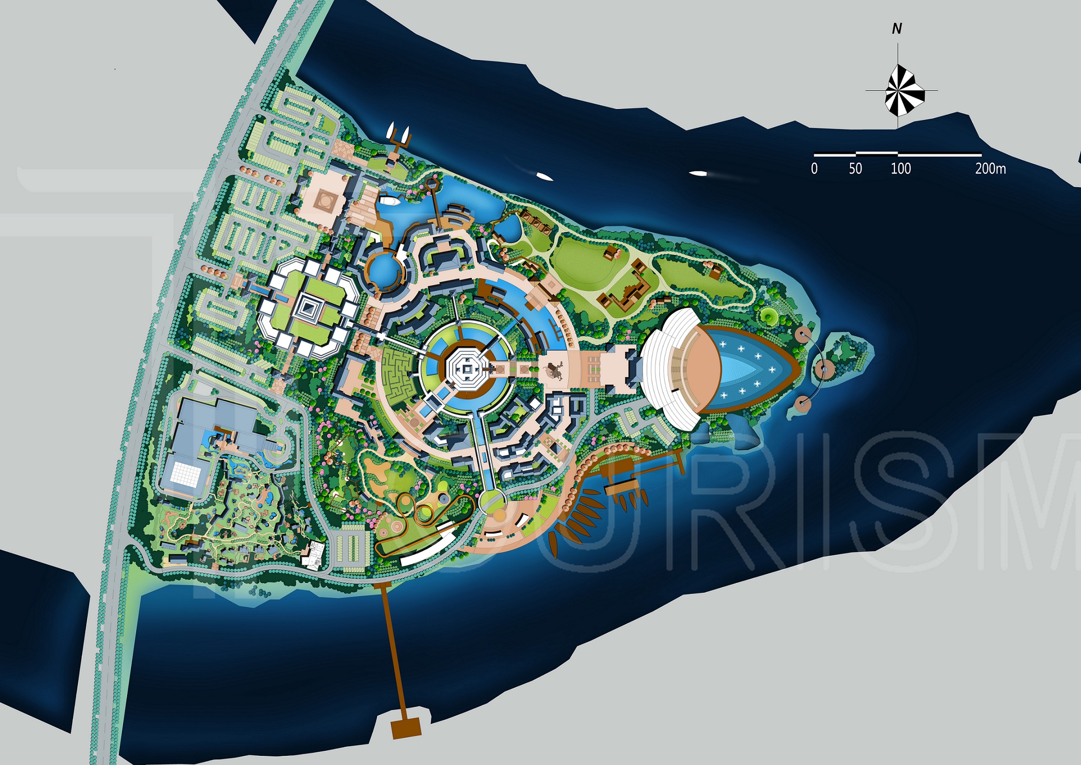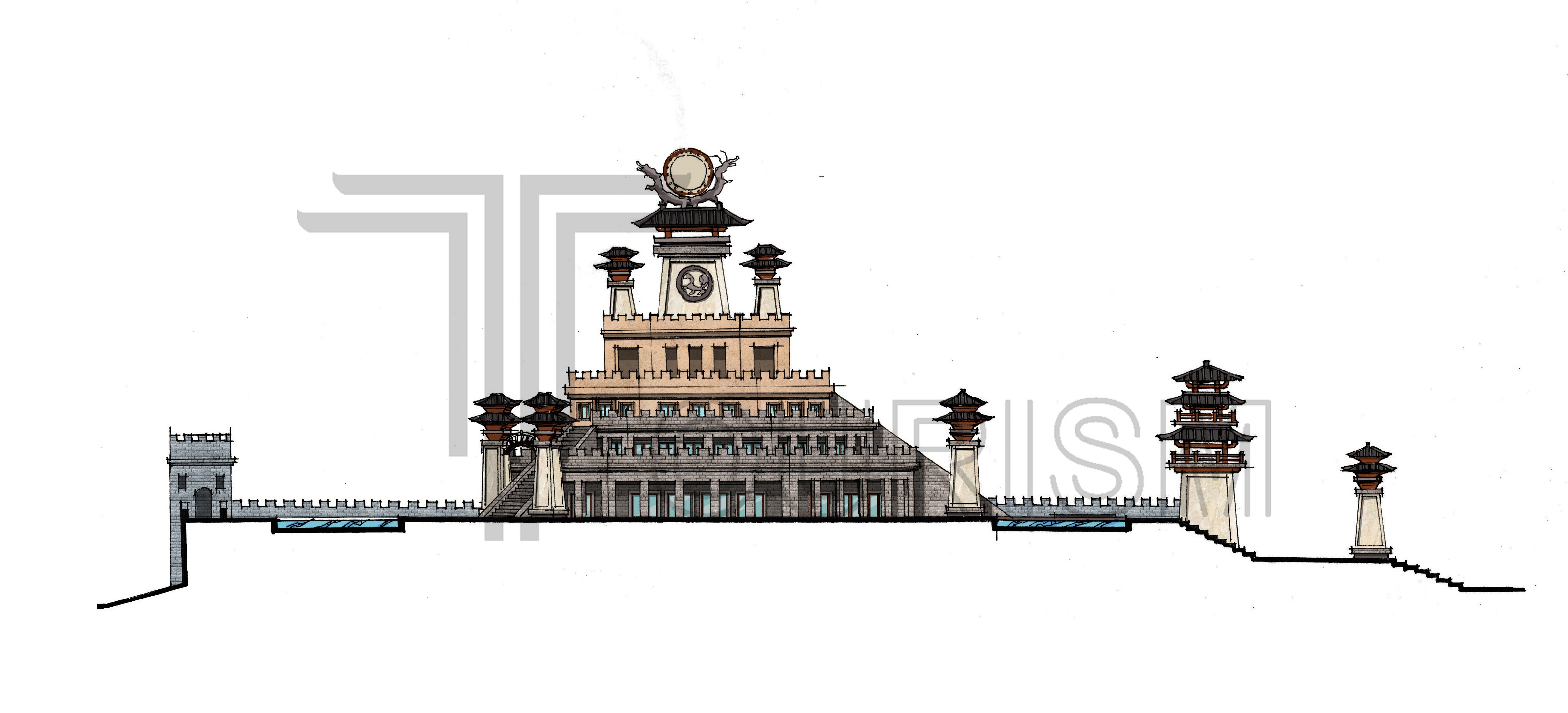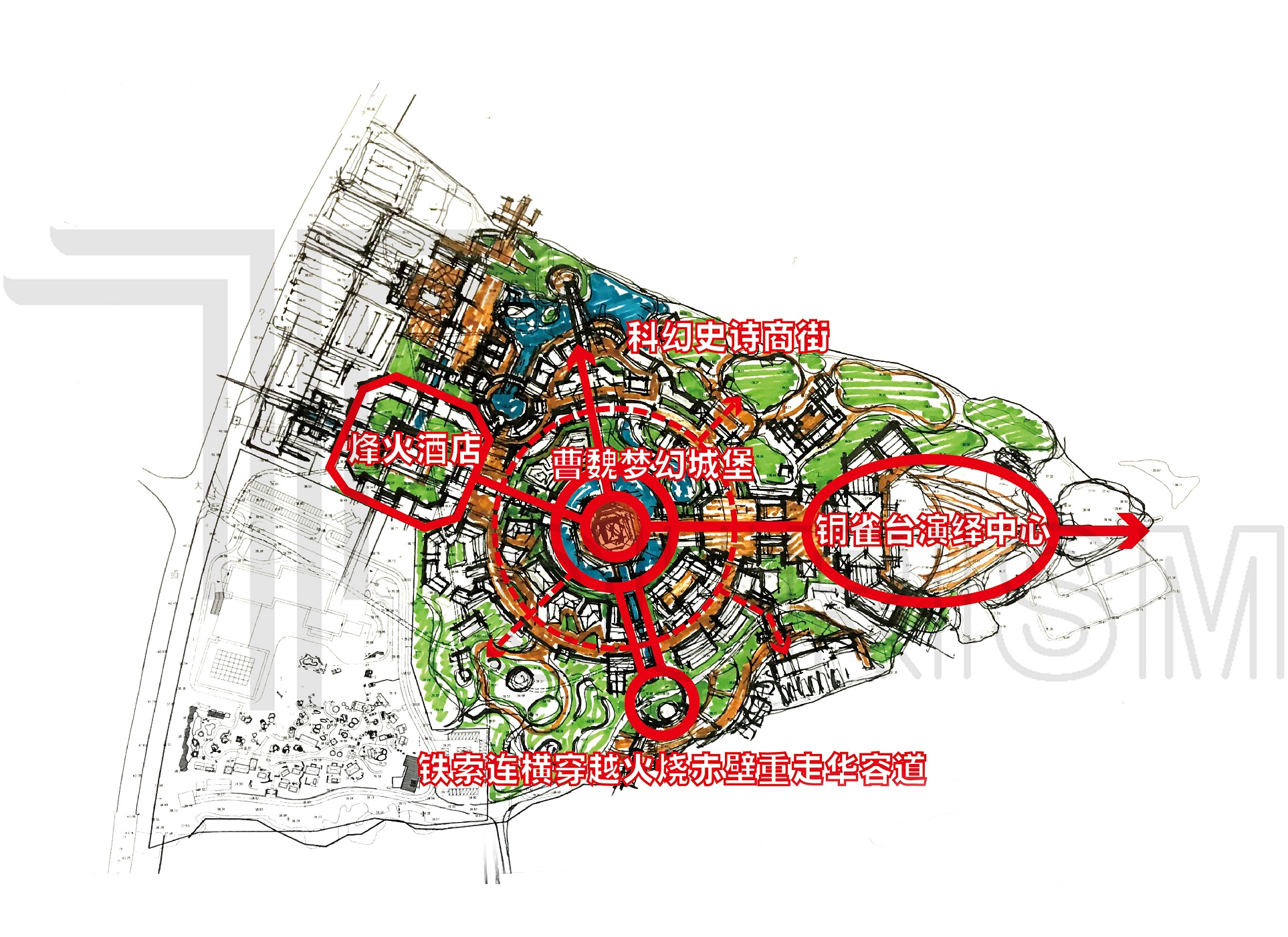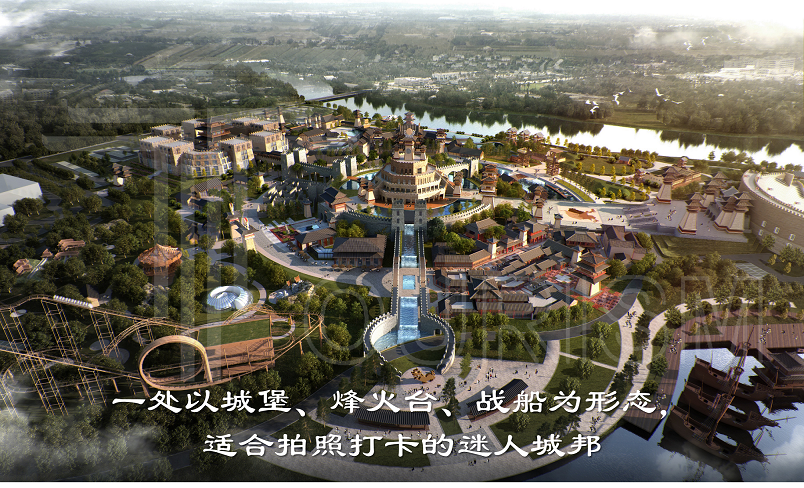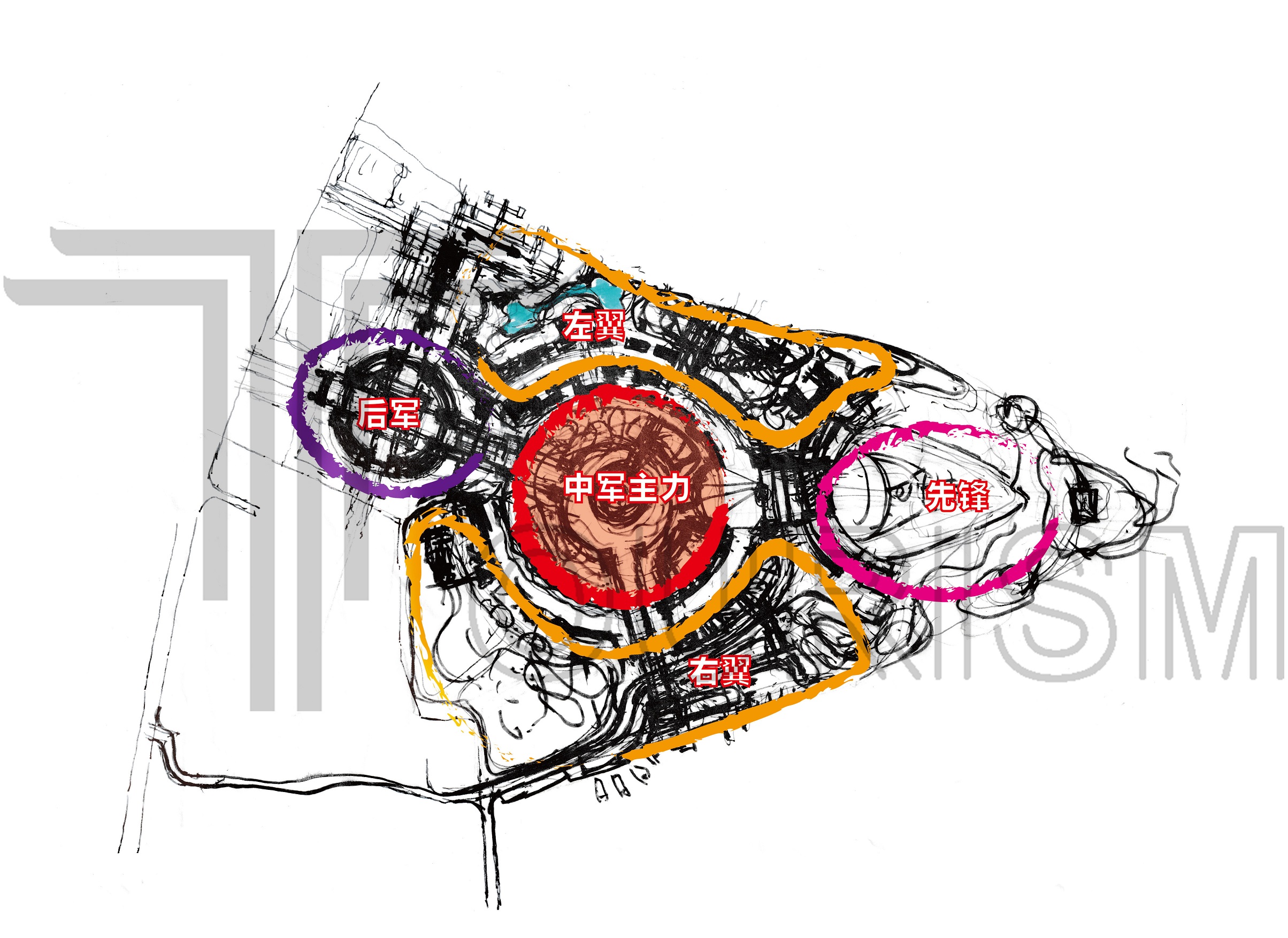 在此次竞标中,项目组围绕“魏武千年英雄乐园”的总体定位,按照时间线索进行主题推演,以科技梦幻要素进行千年穿越创想。在平面空间上以中国古代阵法为蓝本,以先锋、中军大寨、左右护翼、后军压阵为布局思路,设计了曹城堡梦幻中心、烽火台酒店、大战船演艺中心等战争建筑叠加旅游功能的地标,充分实现英雄史诗与梦幻娱乐碰撞。