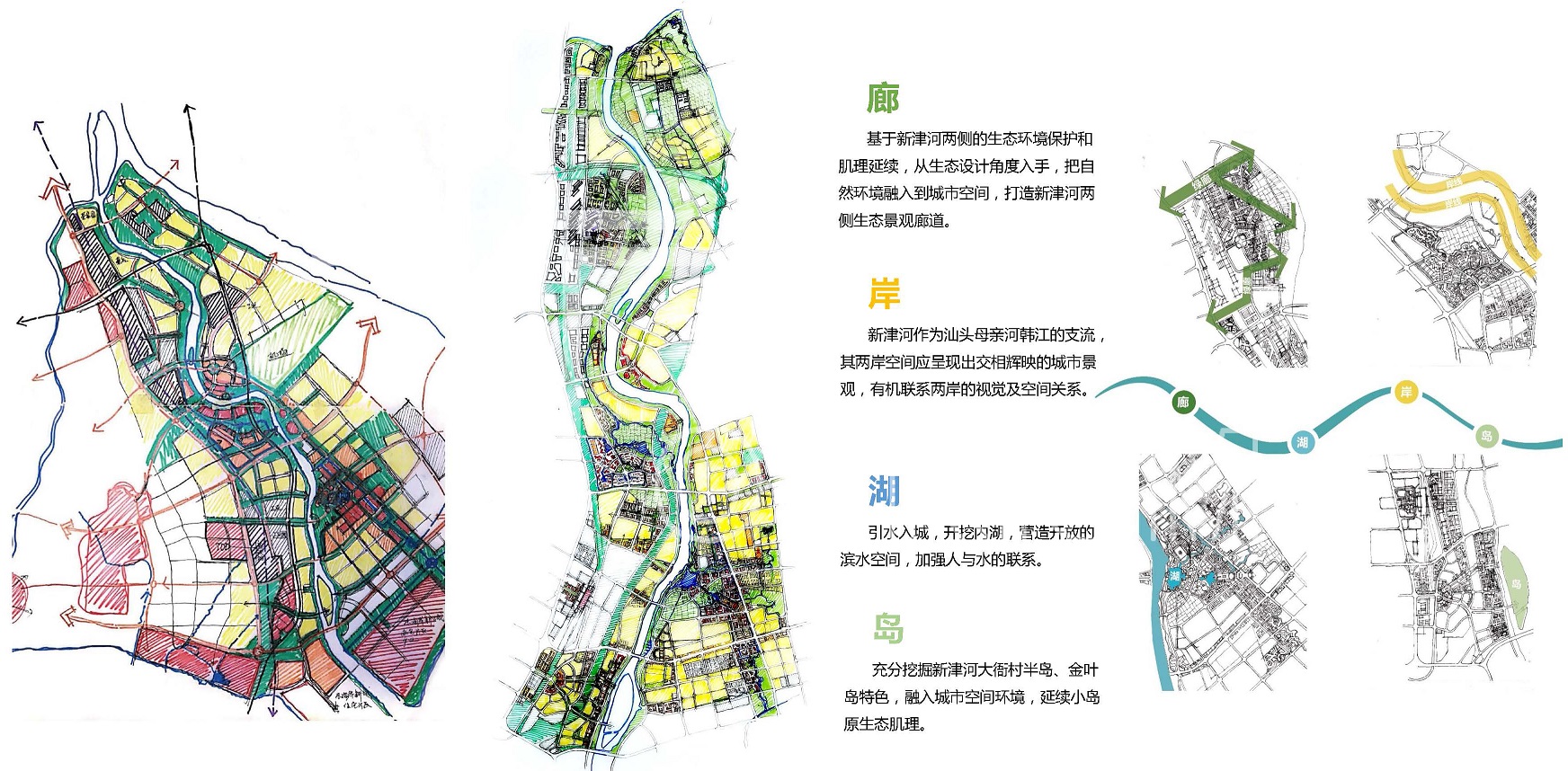 汕头市近年加大新津河“一河两岸”景观工程开发建设。基于中心河道景观系统一体化考虑,编制《汕头市新津河“一河两岸”景观工程概念方案设计》;基于一期开发建设项目,编制《汕头新津河“一河两岸”景观带一期修建性详细规划》;基于重大城市生态游憩空间对城市人居环境、产业空间、土地价值的影响,以新津河为主轴,两岸各延展将近1公里,编制《汕头市新津河“一河两岸”用地城市设计及两侧用地多规协调规划》,并形成《城市设计公众参与报告》《城市设计调研报告》。