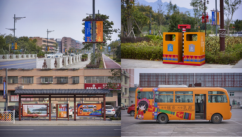 在城市家具的设计及制作方面,我司从打造风情城市的角度出发,提取瑶族色彩、纹饰、图腾等,对县内的城市灯饰、垃圾桶、道路标识牌、公交车站、旅游公交巴士进行民族艺术创作,形成了一批具有公共艺术色彩的城市家具,配置在主要风景道路及城市游憩空间中,让瑶族风情元素融入生活,实现旅游基础服务设施的主客共享。