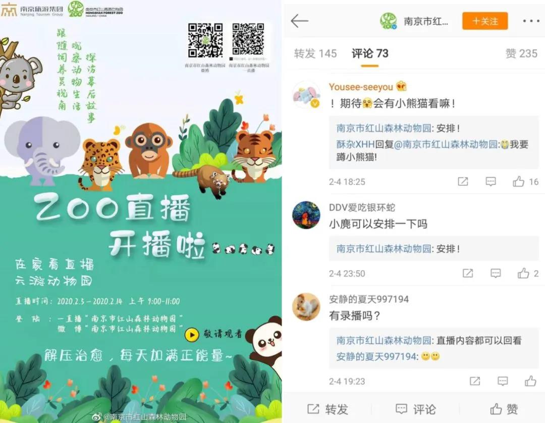 直播或成文旅线上营销新亮点。火神山直播万众瞩目,那么疫情下景区无法线下打卡,也可线上“签到”。例如南京市红山动物园宣布在2月5日至2月14日,每天上午9点至11点开通直播,让大家云游动物园。广大网友已经点名要看小熊猫等动物。哪怕疫情之下没有游客,但至少也能吸引一些宅在家里渴望去远方的看客,这群看客中,便有一部分能在疫情结束后,转化成为到访景区的游客。