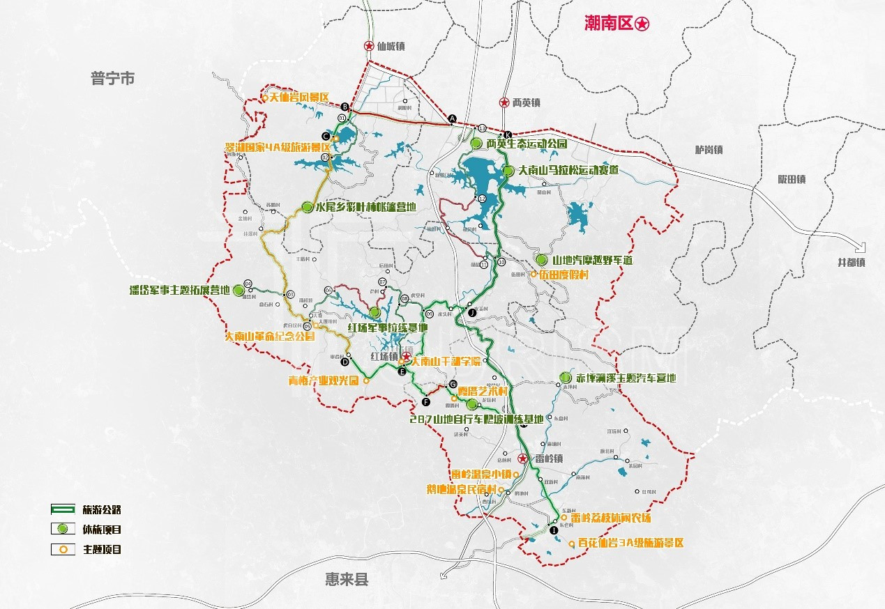 汕头市潮南区全区一半平原一半山,平原开发已趋于饱和,潮南区政府提出建设大南山旅游公路的思路,以路为带,驱动大南山发展。我司受委托对大南山以两英镇、红场镇、雷岭镇、仙城镇为核心的区域进行规划,为潮南发展寻找新动能,最终形成上述两个规划设计方案。