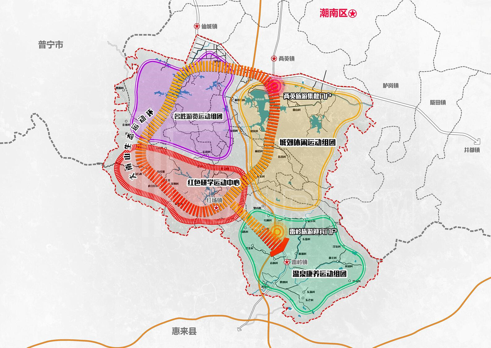 《规划》认为,大南山是潮南区、普宁市、惠来县三地共同的生态中心,周围已形成聚纳500万人的密集城镇带,1930年前后轰轰烈烈的大南山革命就发生在这里,因此大南山是潮普惠人民的生态绿肺、父亲山和革命圣山。《规划》提出打造“革命纪念地、体育运动山”的发展思路,以大南山旅游公路为大动脉,以红色重镇红场镇为红色研学中心,两英、仙城、雷岭三大组团协同发展,布局“一环一心三组团”的空间布局,推动“环线开发、红色驱动、组团发展”助力大南山跨越式发展。