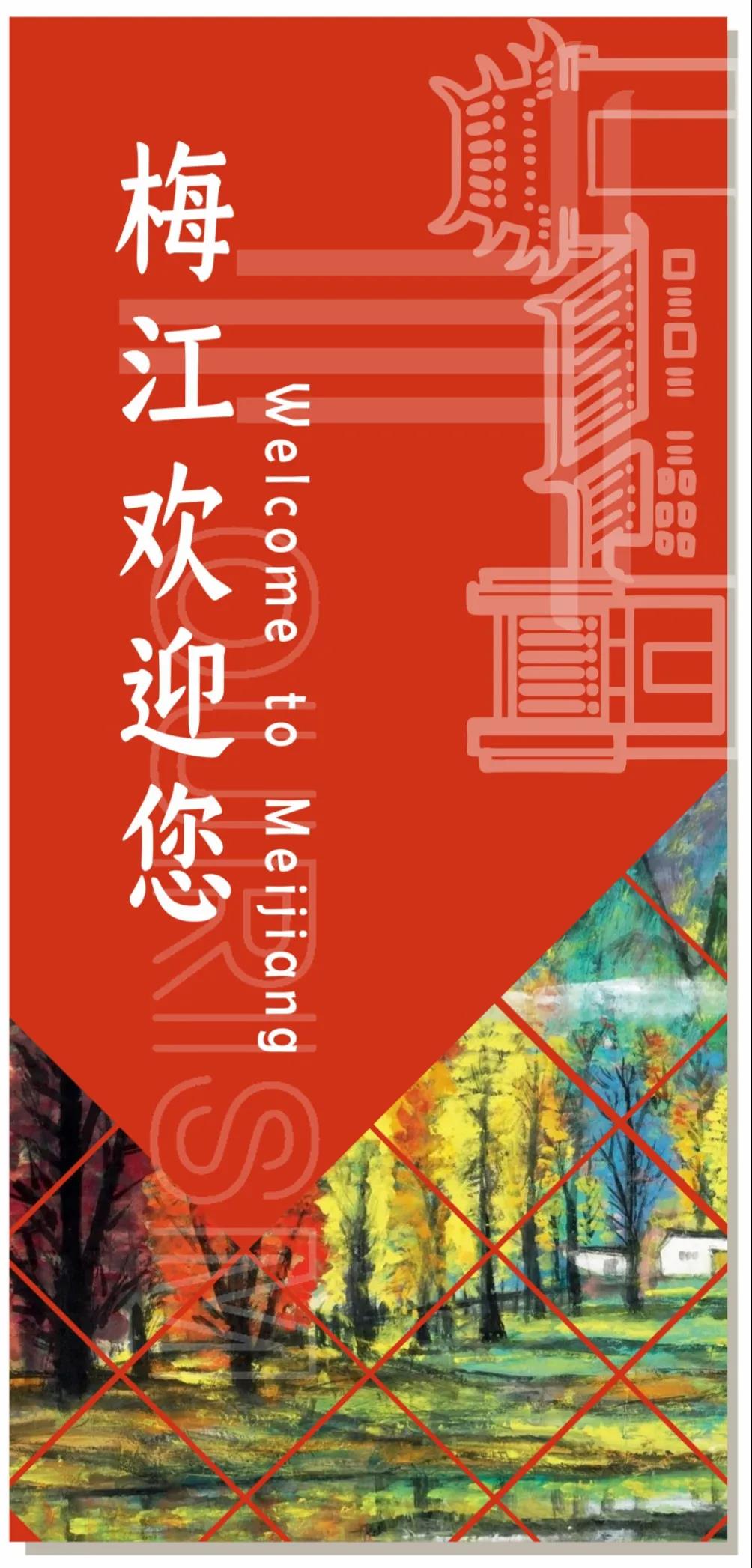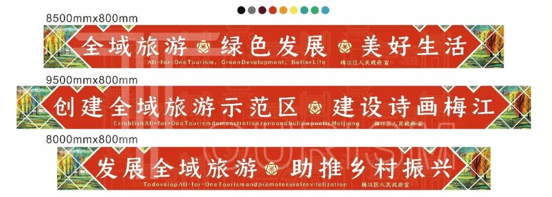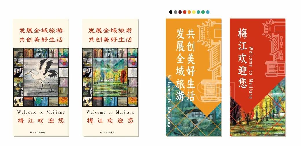 梅江区是梅州市的文化发祥地。在创全对标整改方案中,项目组也思考将梅江深厚的历史人文底蕴融入全域旅游发展当中,探索“诗画梅江”城市品牌的旅游化表达路径,让“诗画梅江”城市品牌更加生动形象、亲切可感。项目组以黄遵宪人境庐故居和林风眠画作为创意源泉,提取“诗画梅江”的代表性元素,设计了一套具有梅江特色的创全宣传材料,涵盖城市LOGO、宣传横幅、宣传海报、宣传刀旗以及旅游公交专线主题包装等,以营造全域旅游氛围。