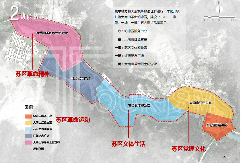 方案以“重点打造,串点成线”的思路,形成“一心、一寨、一带、一场、一碑”五大节点,重点建设、提升大南山革命纪念园入口标志、闽粤赣边区第一次党代会纪念馆、苏区戏剧运动展墙、大南山革命烈士纪念碑等20个项目。全部工程计划两个月,其中一期工程投资1000万元,计划两个月内完成施工。