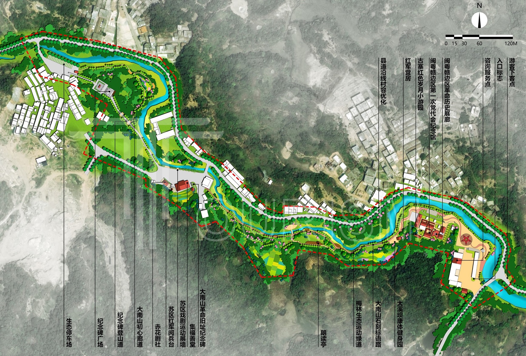 大南山革命纪念园位于红场镇大溪坝村,土地革命时期,红场镇是大南山苏区的革命指挥中心、政权建设中心,因此,大溪坝村是大南山红色资源的主要聚集地。2019年11月,潮南区委托我司编制《潮南区大南山核心区旅游发展规划暨重点项目概念规划》,大南山革命纪念园项目作为重点项目之一,率先启动,形成《大南山革命纪念园建设规划设计方案》(以下简称“方案”)。本次设计将对方案进行深化,并同步启动施工建设。
