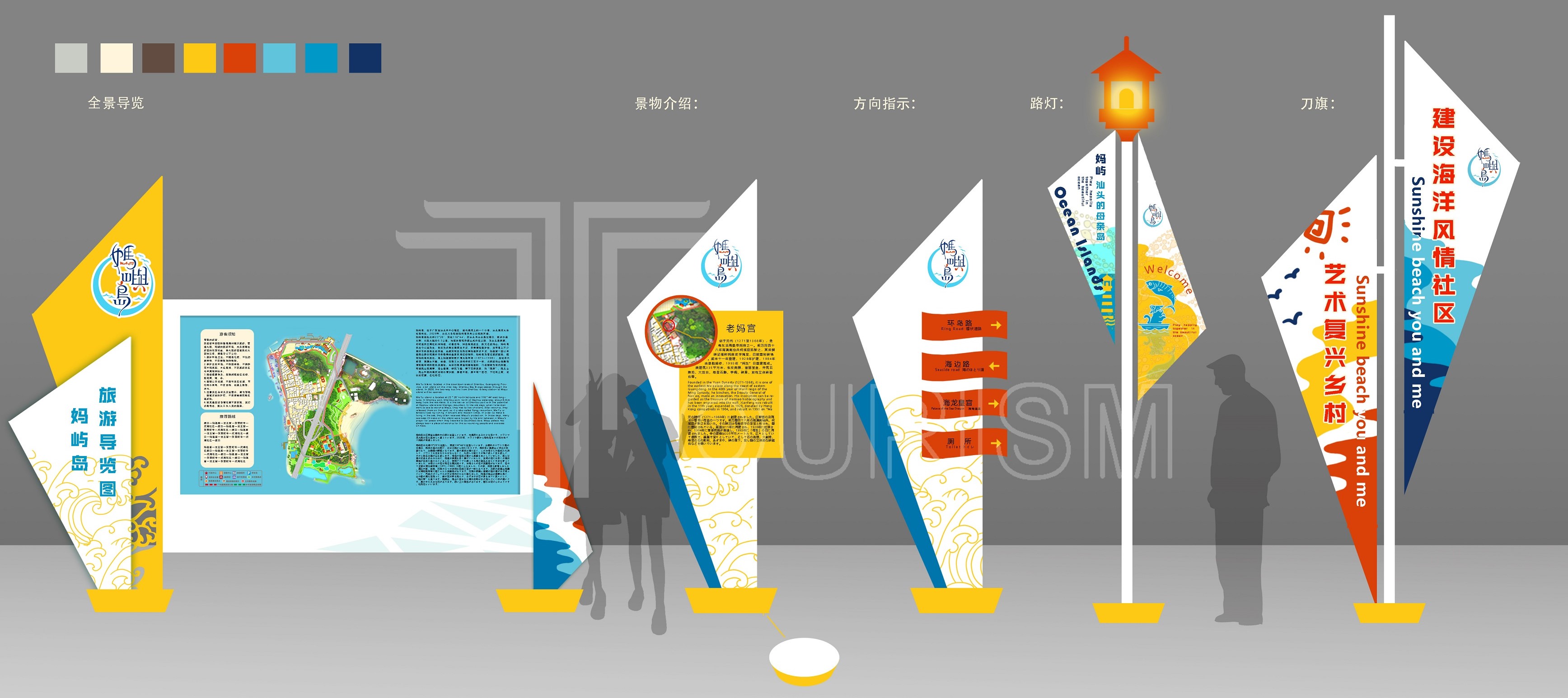 项目组提取阳光、海浪、沙滩的橙、蓝、黄为主色系,利用风帆、海豚、海鱼、渔灯、渔船等海洋元素,对妈屿岛的旅游标识系统、视觉识别系统、宣传营销系统进行广泛设计,形成一批海洋风情鲜明、艺术感知强烈、青春时尚的公共艺术作品。我们将争取在全岛实现运用,将妈屿岛打造成海洋艺术小岛,打造内海湾海洋休闲旅游标杆。