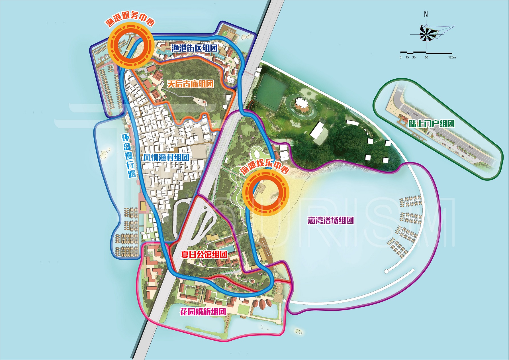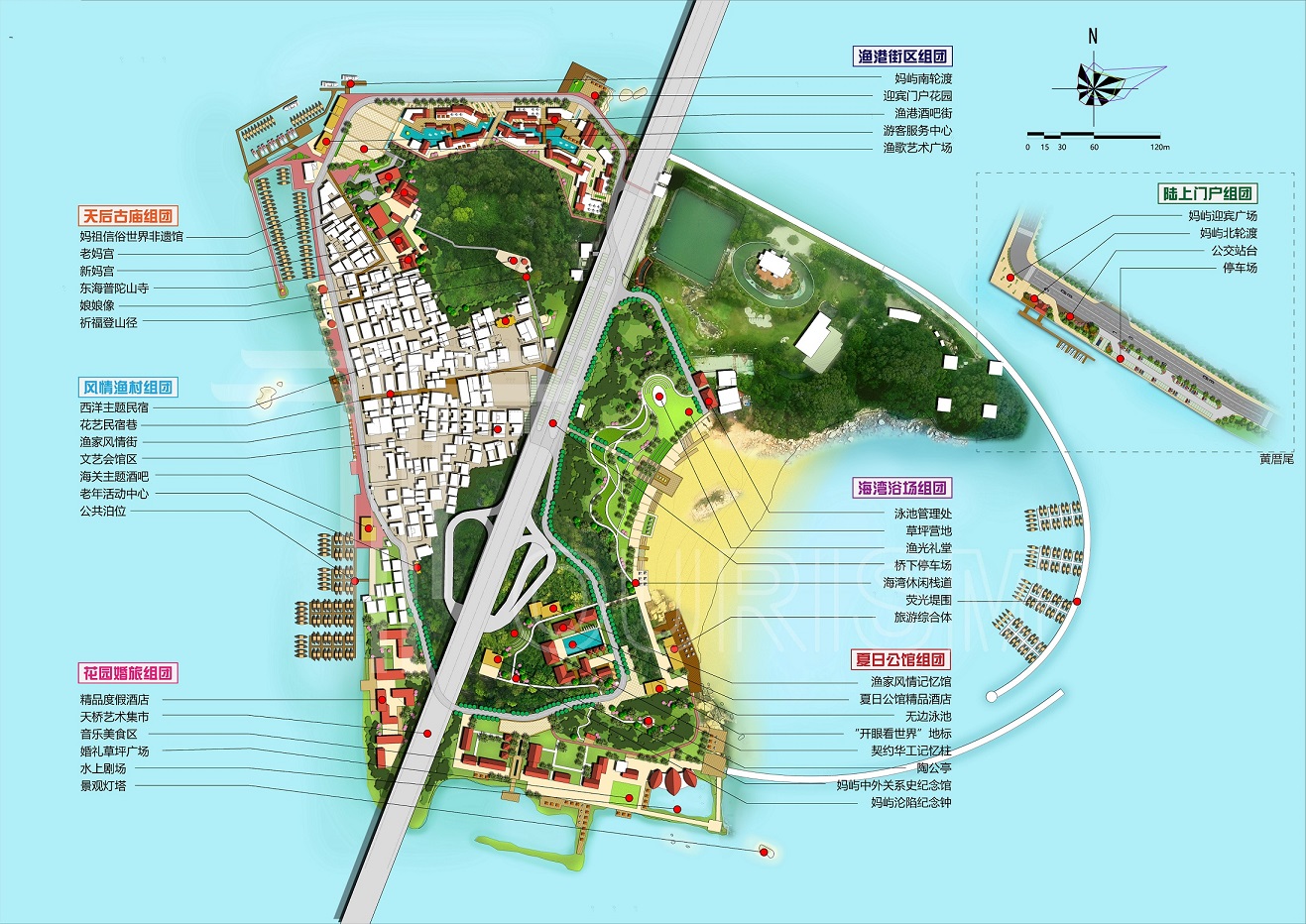 围绕此定位,《规划设计》形成“一环 • 两心 • 七组团”的空间布局,重点建设渔家风情街、花艺民宿巷、海湾沙滩浴场、花园婚礼广场四大休闲产业发展空间。基于提升妈屿历史文化地位、承载城市文化演绎平台考虑,形成妈祖信俗世界非遗馆、妈屿中外关系史展览馆、海洋风情馆三大综合馆群。基于创建国家4A级旅游景区、提升旅游综合服务能力考虑,提出在妈屿轮渡区域依托闲置物业改造游客服务中心、扩建内海湾游轮泊位;提出在海湾大桥桥下规划停车场,建设公交站点,管控进岛车辆;提出策划组织妈屿中秋渔灯节,打响妈屿影响力。