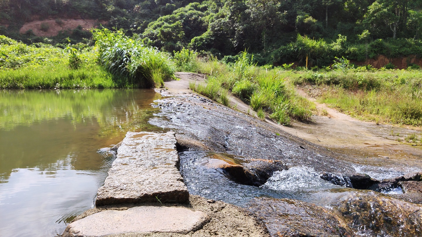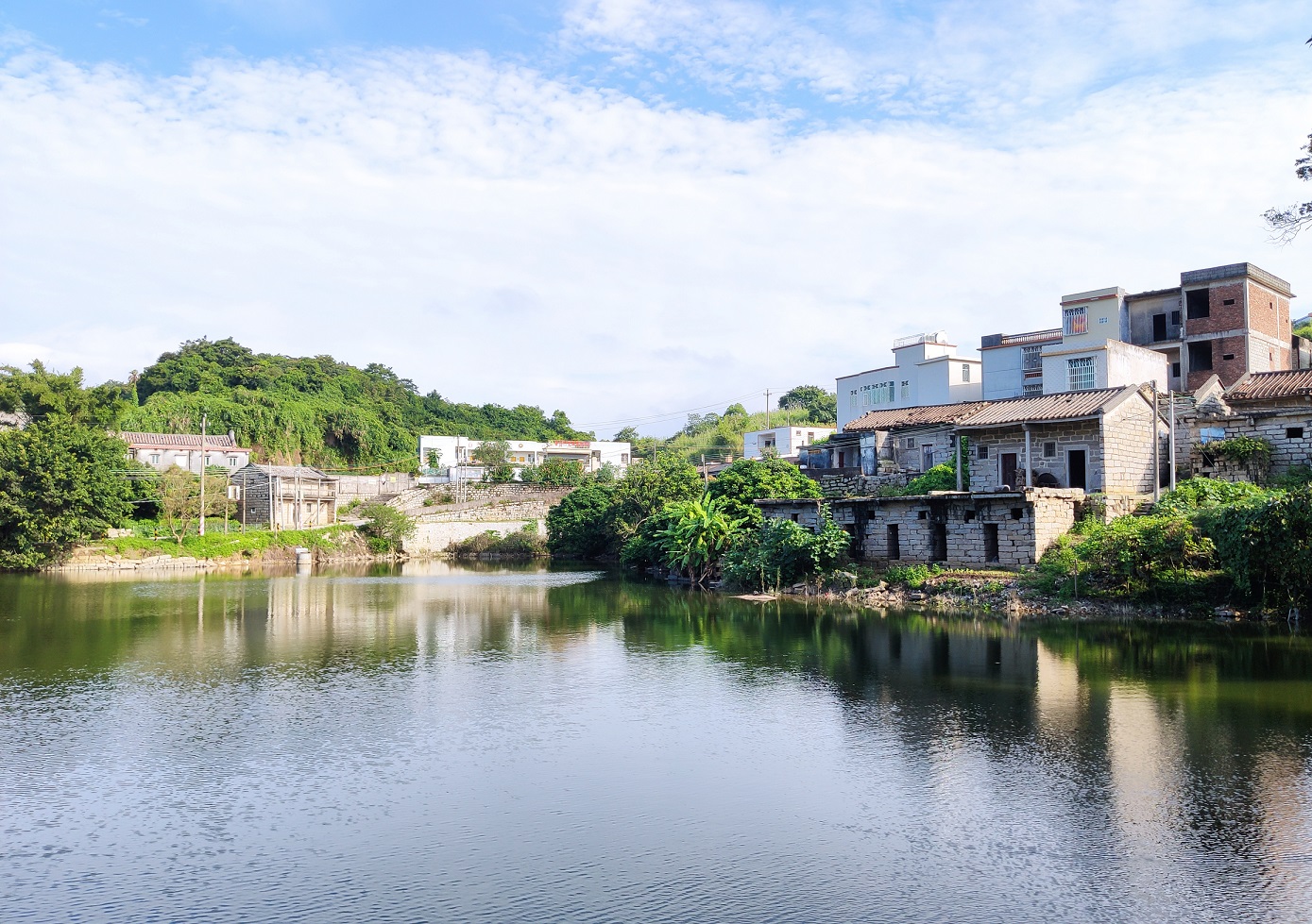 潘岱村石头厝与水潭,呈现静谧乡村景象