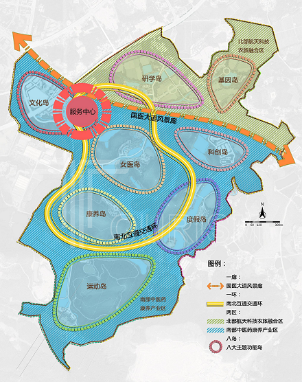 《规划》提出,要搭建大健康一二三产联动综合体平台,推动国医谷建设发展。一是根据最新中医药科技发明,调整优化场地内特种中医药种植结构。二是立足南医,放眼华夏中医药文化,植入园区文化研学与游憩体验。三是充分利用现有存量建设用地,北区升级原有航天科技种植产业,重点建设岭南药用植物园、中药基因库、中医药研学教育功能,南区主打健康养生、康养度假、医疗康复、会议会展等文商旅功能。