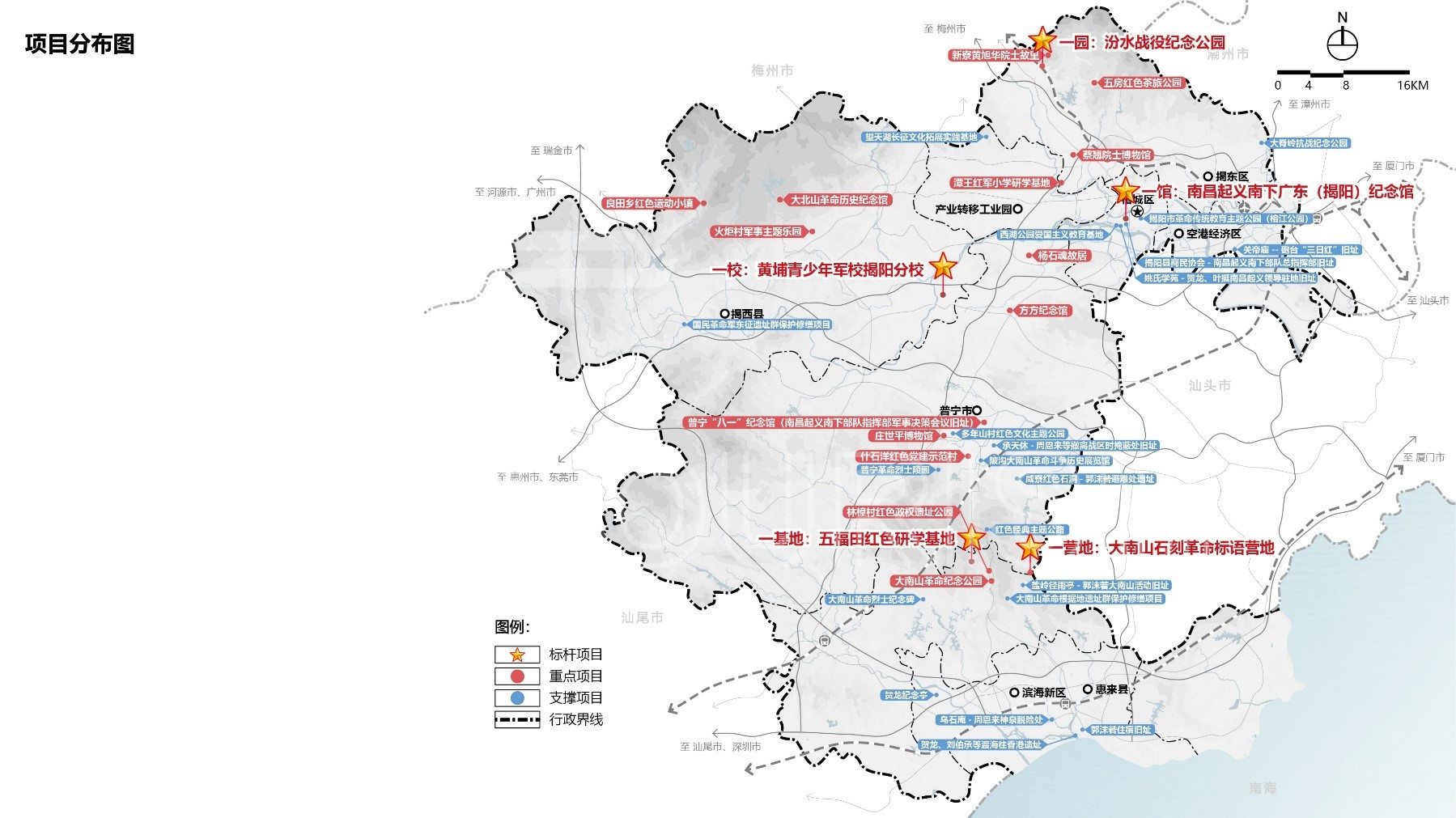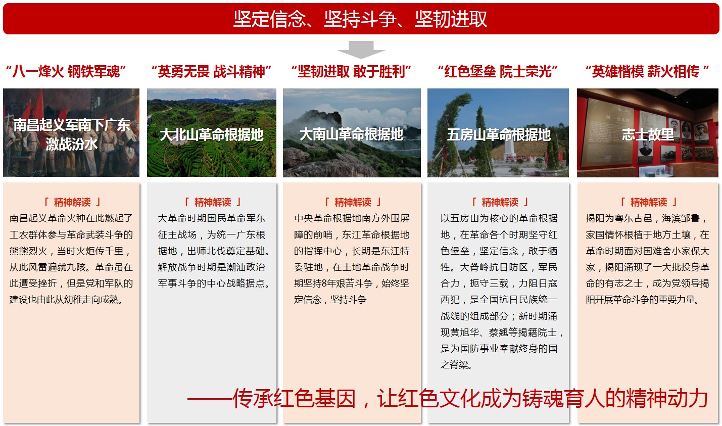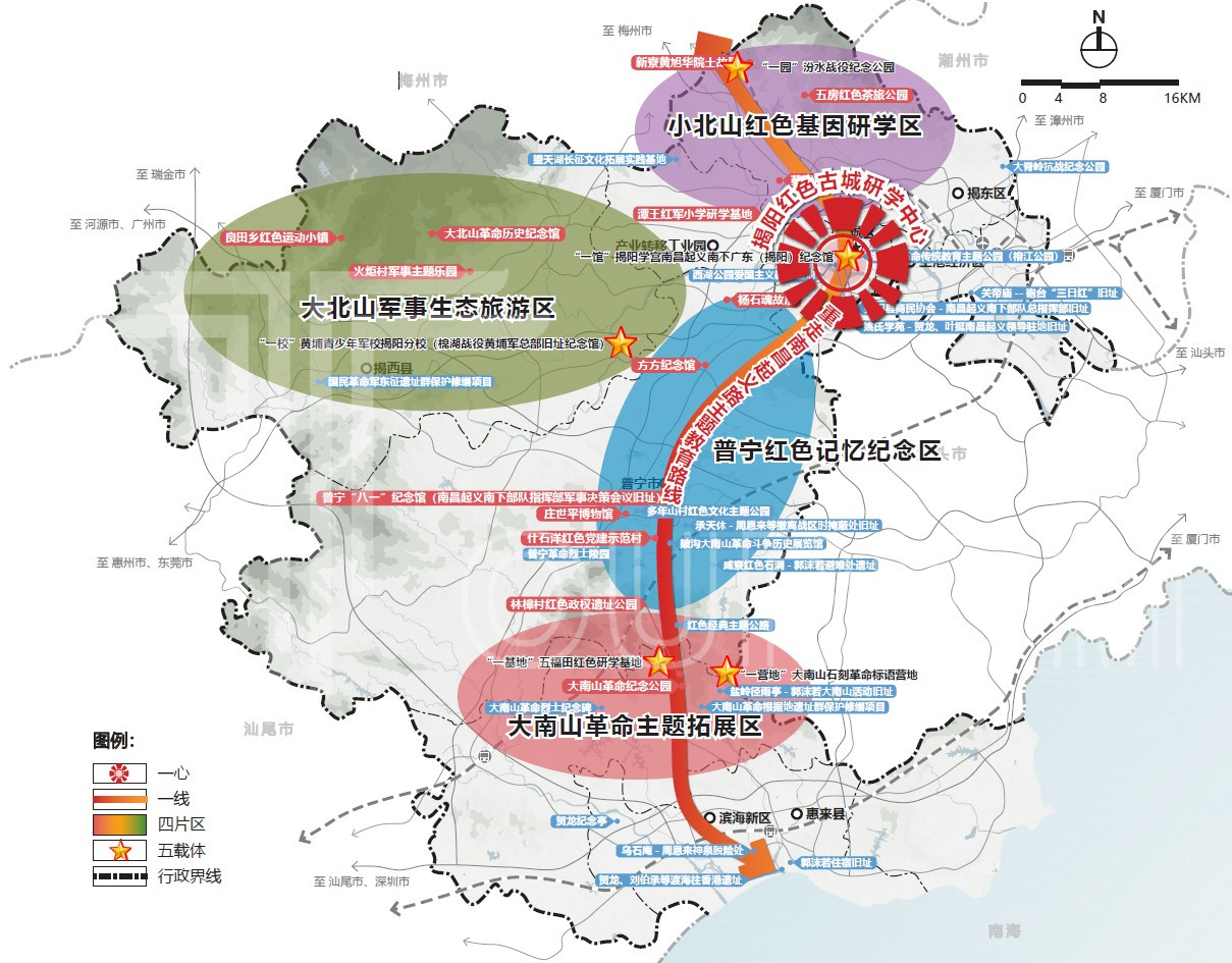 规划聚焦统帅全局、可率先启动的核心区,筛选可外联内拓、联动城-山-海全局的主题线路,中尺度视野下培育四个资源集聚、特色突出的示范片区,提炼支撑品牌体系构建的五大载体项目,形成“1+1+4+5”揭阳市红色资源保护、利用、开发体系。此外,提炼区域红色革命文化精神,为提振老区发展提供精神动力和承接载体。