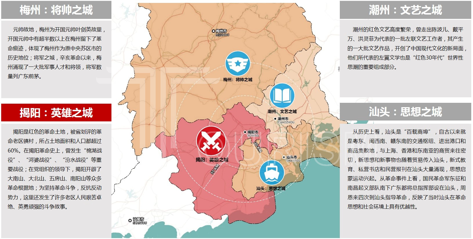 项目组针对揭阳市红色资源在全市层面呈现散、弱、小,中尺度下集聚分布的特征,提出主题资源群视野下,跨区统筹开发的思路。聚焦揭阳古城、大南山、大北山、小北山等集群空间,响应各个片区在革命时期作为南昌起义军入境揭阳驻地、东江革命根据地、海陆丰革命根据地、潮汕抗日根据地、闽粤赣边区重要组成部分,为片区富集的革命遗址资源连片打造、教育基地建设、文化旅游开发和文艺精品创作等统筹规划设计、资金分配及宣传推介等凝聚力量。