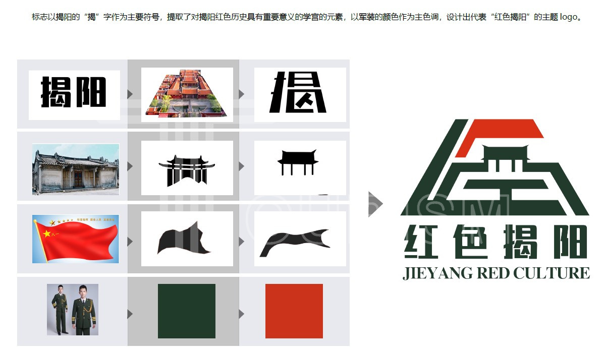 围绕“红色热土、英雄之城”的主题,符号设计选取代表代表揭阳城市原点的地标,周恩来总理曾三次下榻的揭阳学宫的平面与“揭”字型融合,叠加军旗、军装等革命元素,实现揭阳古城人文精神同革命精神的融合,形成传承揭阳革命文化的重要符号。