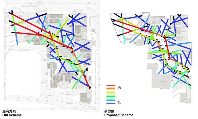 以杭州武林广场商业街改造为例。改造后的空间布局更强调室内商业街的可达性,而非主次入口处。由于店铺主要分布在室内商业街的两侧,那么沿室内商业街的店铺的可达性就得以强化,为其带来更多的商机。