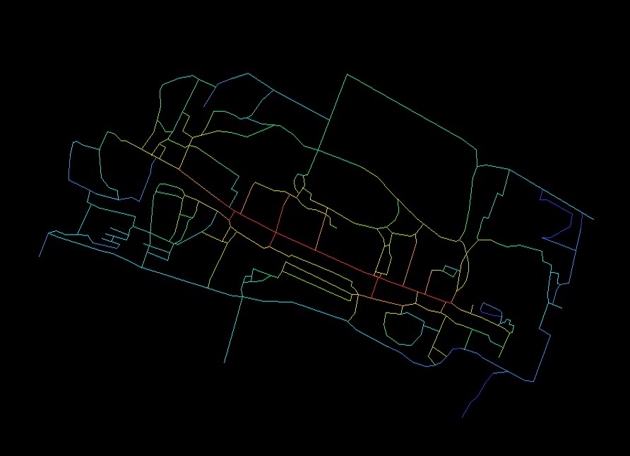 轴线即是从空间中某一点所能看到的最远距离,每条轴线代表沿一维方向展开的一个小尺度空间。“轴线指数”越“强”,则潜在的移动、行进、转移和运动的频率或强度越高。