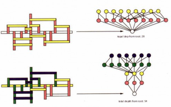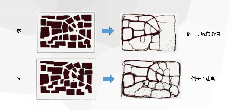 举人的空间感知试验作为例子:在一个设计实验中,人被要求从最左边到达中心的主要空间,然后再返回。图一我们可以比较容易地得到空间联系结构,在其间的人能看到要去何处以及在何处。图一结果明显地显示出人的运动轨迹和空间结构的关系,有明显的人流量路径区分。图二稍微移动了地块。减弱空间之间的线性联系,和图一比较,图二同时失去了结构和相互可见性的程度。在其间的人能看到他们在何处,但完全不知道下一步会去哪里,整个空间充满了难以理解性,整个系统也充满了错误的分支轨迹。