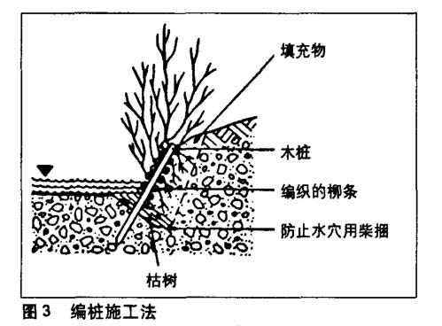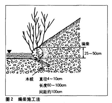 编柴施工法。将柳条扎成捆,制成编柴(也称。梢捆”或。梢笼”).将一捆或数捆编柴横放在河岸边,并以木桩固定.最后将沙土轻轻地覆盖在上面。当柳条生根后,它能牢牢地抱紧土层,从而起到加固河岸的作用。当绿柳成荫的时候,可以减缓水温的上升,为鱼类的栖息和繁殖创造良好的条件。