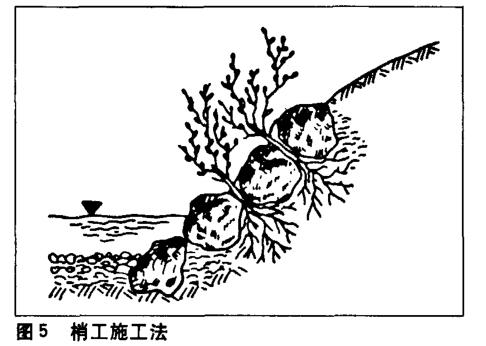 当河岸断面坡度较大时,采用植物与石头相结合的施工方法——梢工施工法。这种方法是将柳枝插入石缝中直至石头的背面,当柳根生长时,便会固定住石头背后的沙土,并紧紧包裹住石块,使石块与石块牢牢地结合成为一体,从而达到保护河岸表面的目的。