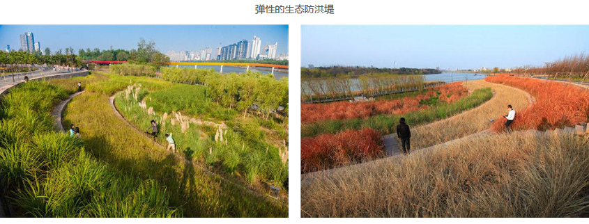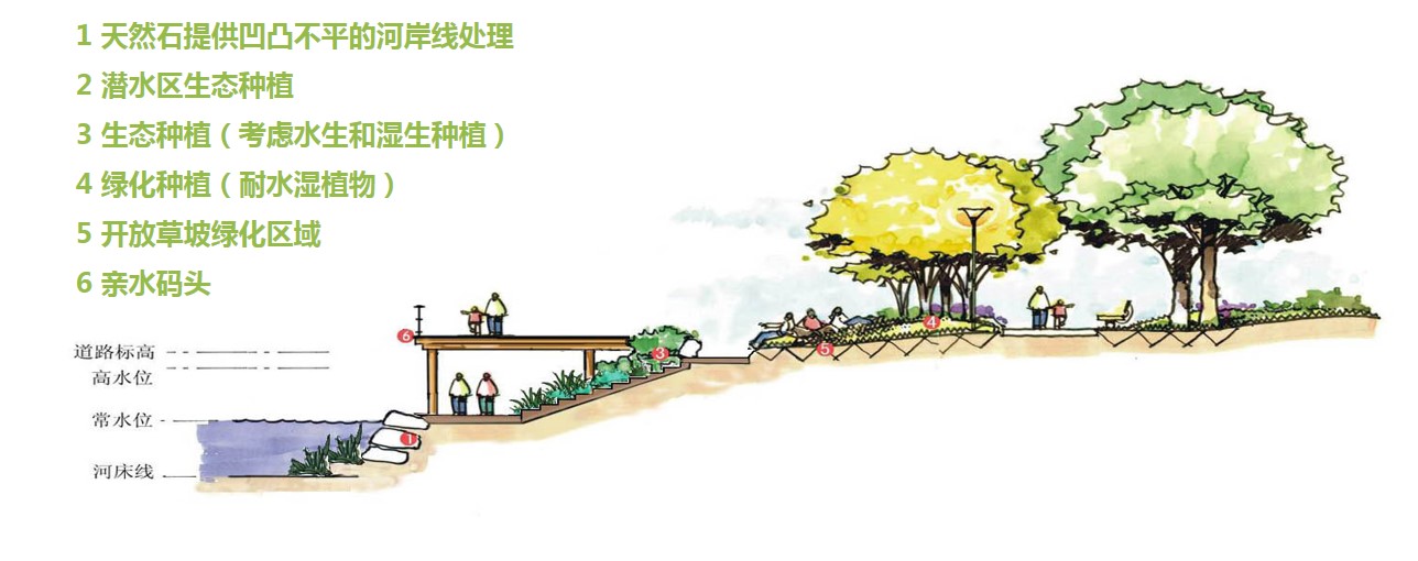 在高差较大的地方应用层层退台方式解决该矛盾,平时低台亲水,洪水期高台防洪。