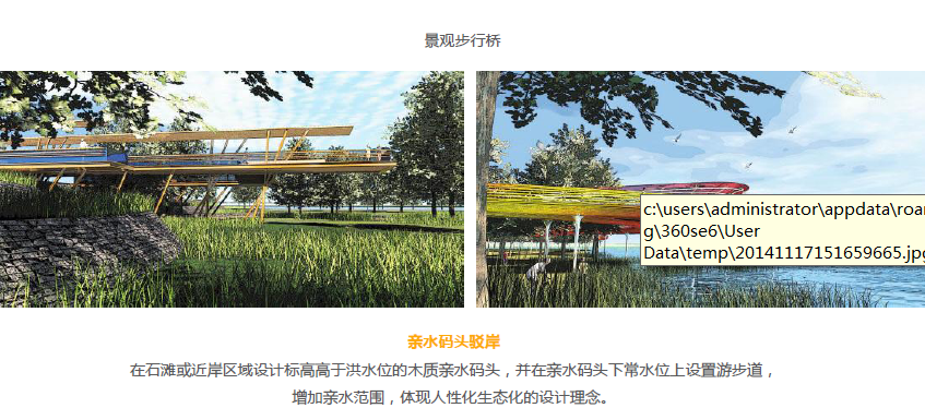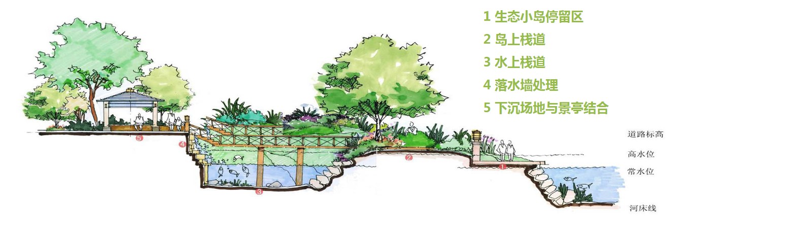 在石滩或近岸区域设计标高高于洪水位的木质亲水码头,并在亲水码头下常水位上设置游步道,增加亲水范围,体现人性化生态化的设计理念。