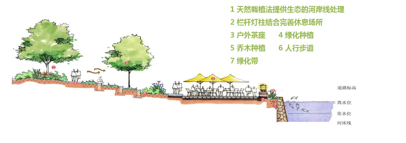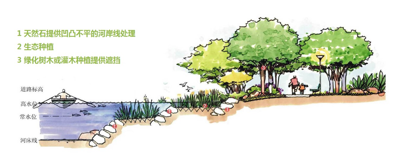 岸边绿化带种植一些水生植物,如芦苇千屈菜等,营造一种自然生态气氛,打破河岸的单调。