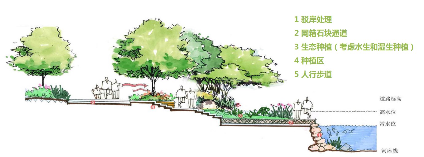 以硬质驳岸的形式,设置草坡台阶解决河岸与河流高差大的问题,既美观大方,又保证河流泄洪期的安全。
