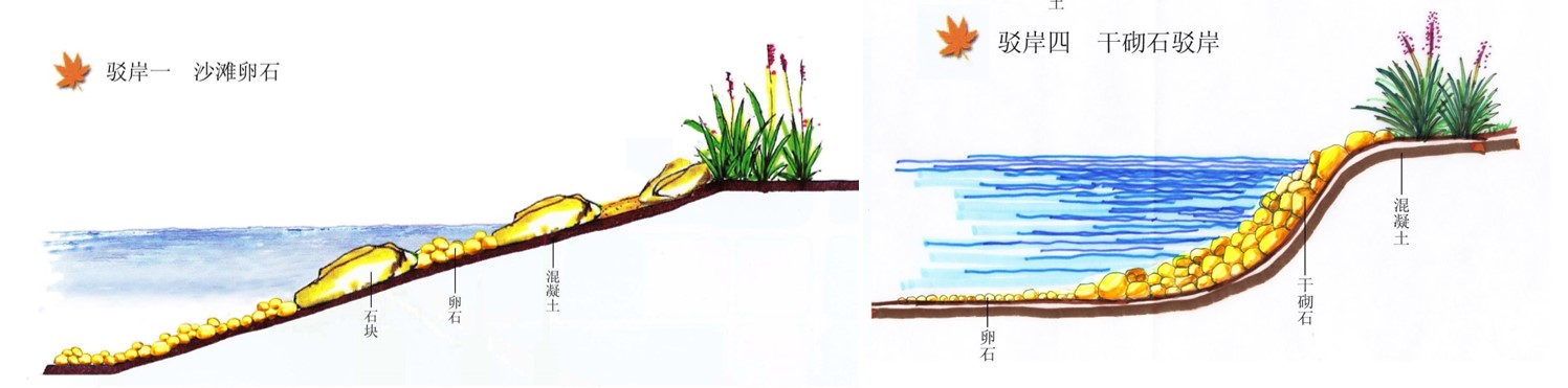对于小型水体和大水体的小局部,以及自然式布局的园林中水位稳定的水体,常采用自然式山石驳岸,或有植被的缓坡驳岸。
