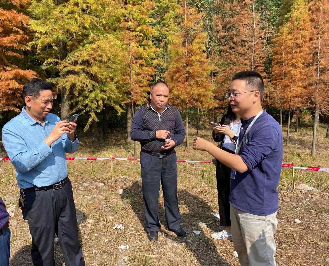 图 | 吴景传与天井山林场谷建国场长、邱流进主任现场交流。@陈靖璇 摄