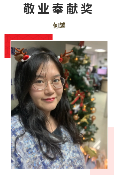 2020年,她筹备了最浪漫的婚礼,把最可爱的宝宝带到身边,转型成为一位职场妈妈。工作至生宝宝的前一天,返工第一周,就奔赴惠来出差,然后迅速补位东湖项目组。在孩子哺乳期期间,依然敬业仗义,敢言敢教,以一言一行感染团队,诠释了职场妈妈的美好风采。