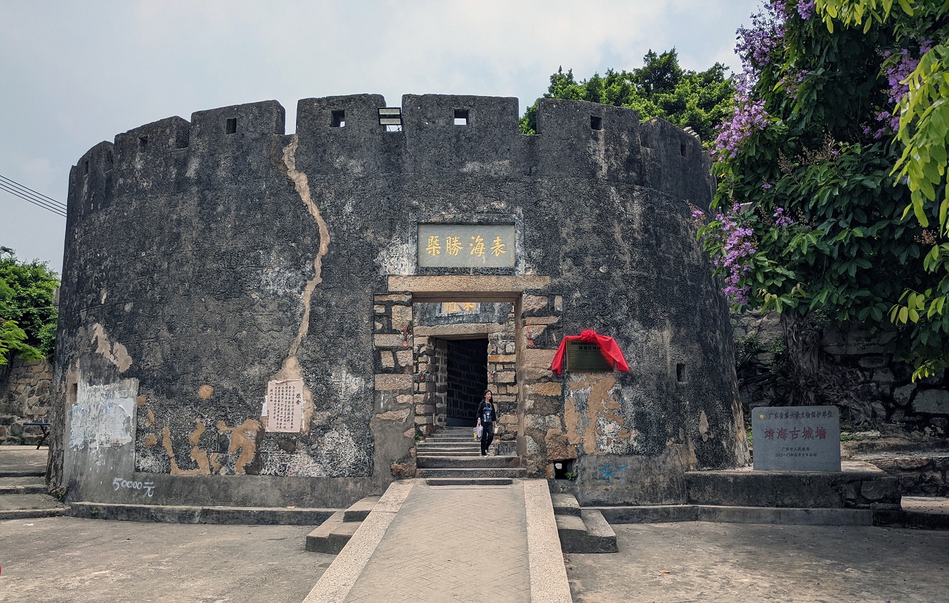 靖海镇位于惠来县东部,是粤东沿海少有的千年滨海古镇,宋元以来历代王朝均在这里设立卫所。明朝初设靖海千户守御所,因所城地势中央突起、四周较低,形状像一头象,象崮驮古城,故靖海城又称象城,民间有“未有惠来县,先有靖海城”一说。靖海所城雄踞南海之滨,古朴奇崛,现存东、北两面城墙及东、西、北三个城门牌匾,是目前粤东地区保存最好的古所城。所城内书斋、宗祠、神庙、古民居林立,是靖海最主要的市集,市井烟火气浓郁。