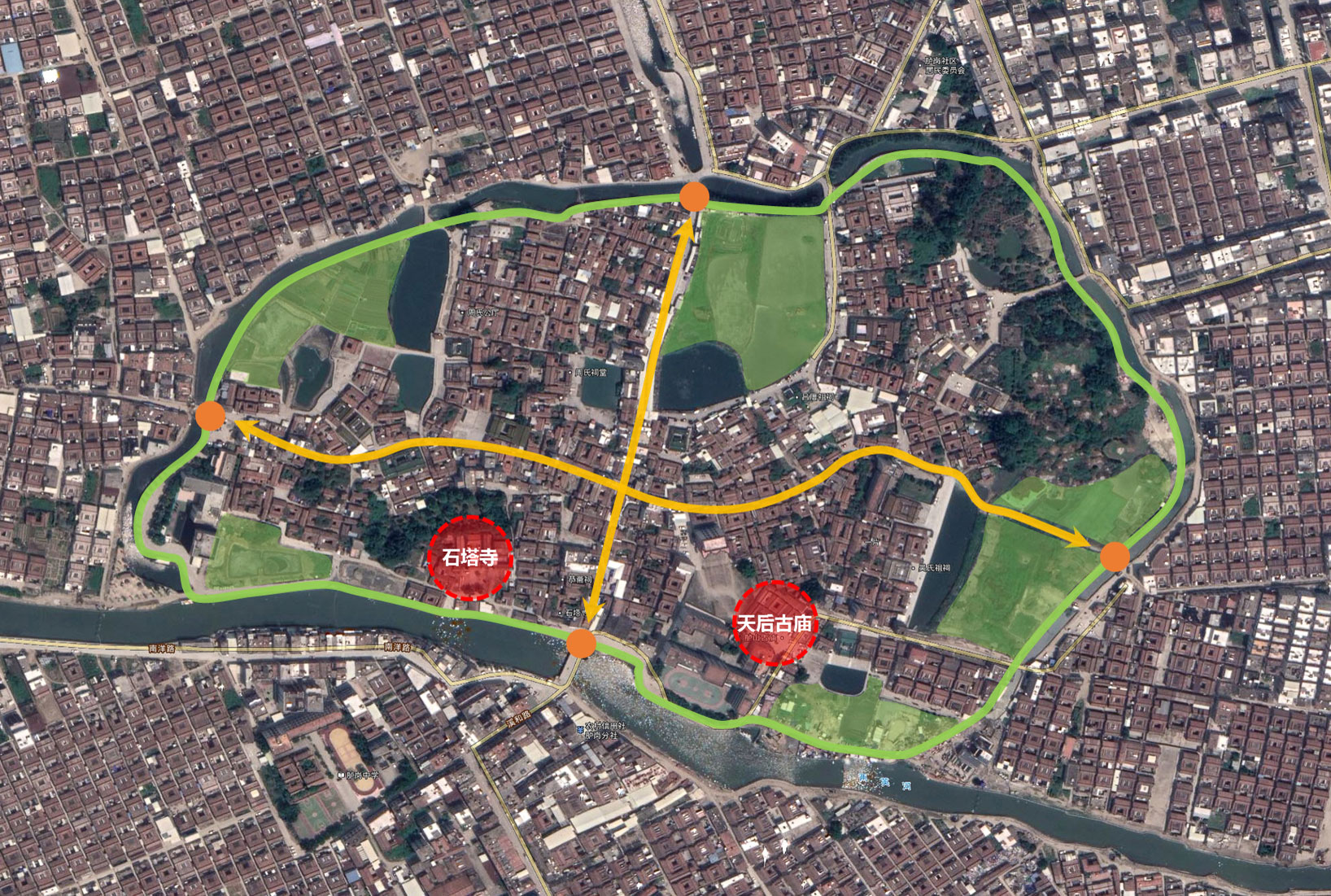 1、构建“一环”,修筑环寨绿道。围绕环形水系,修筑景观绿道,设置健身设施,点缀停车场,营造榕树与芦花交错的滨河景观。将胪岗著名牌坊、著名乡贤等文化融入环寨绿道景观建设。适度组织溪边夜市。
