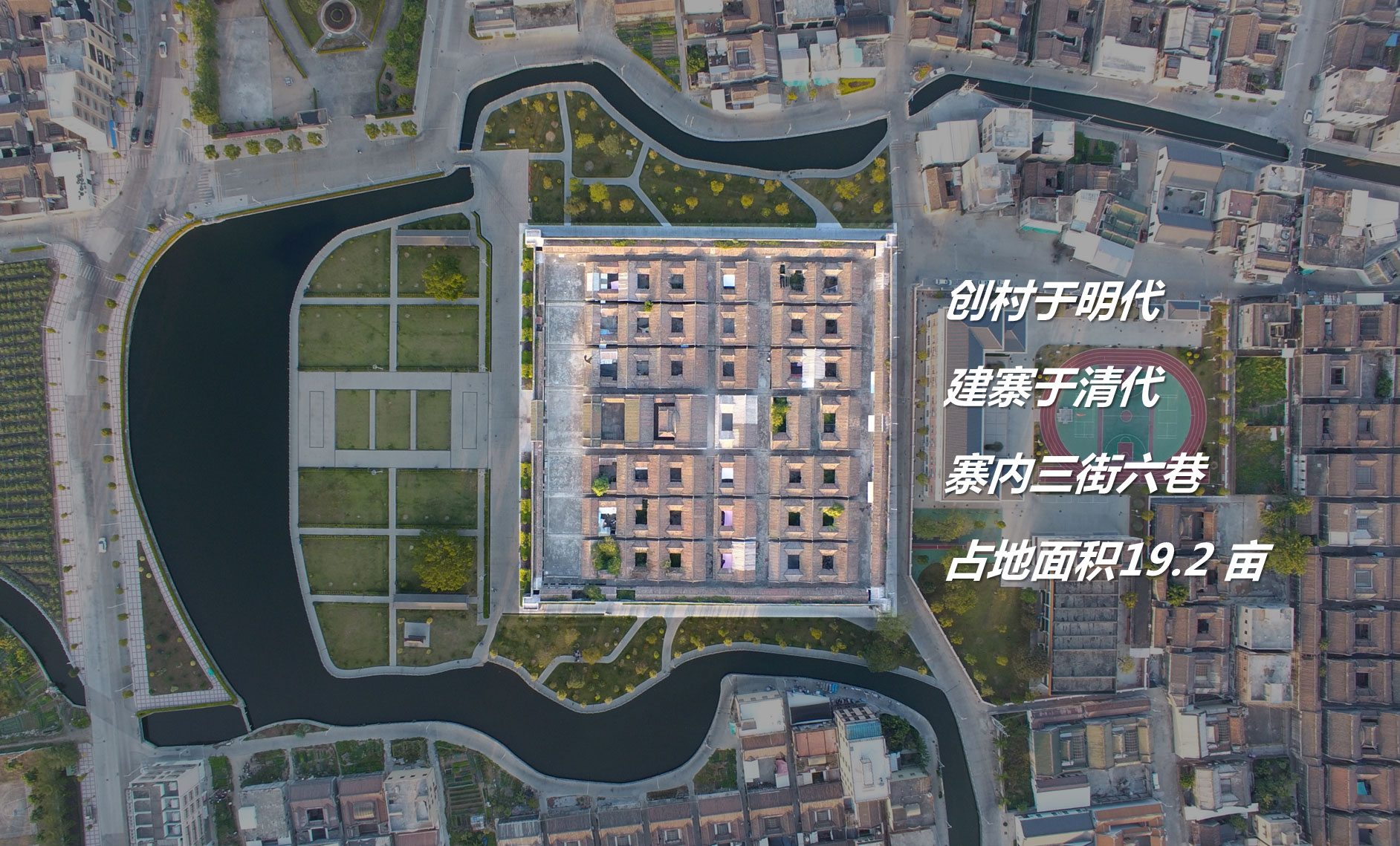 省级文物,建寨于清初,寨内三街六巷,占地面积19.2亩。环绕古寨,有近20亩草坪。环绕草坪,为环形水系。