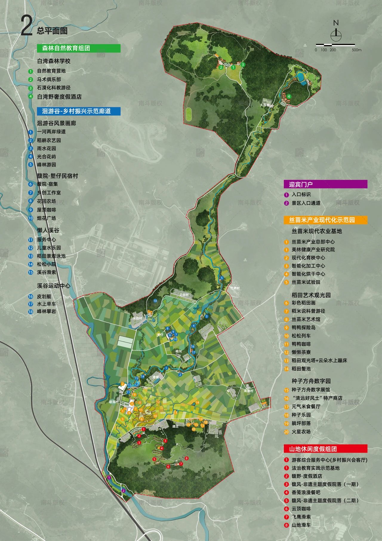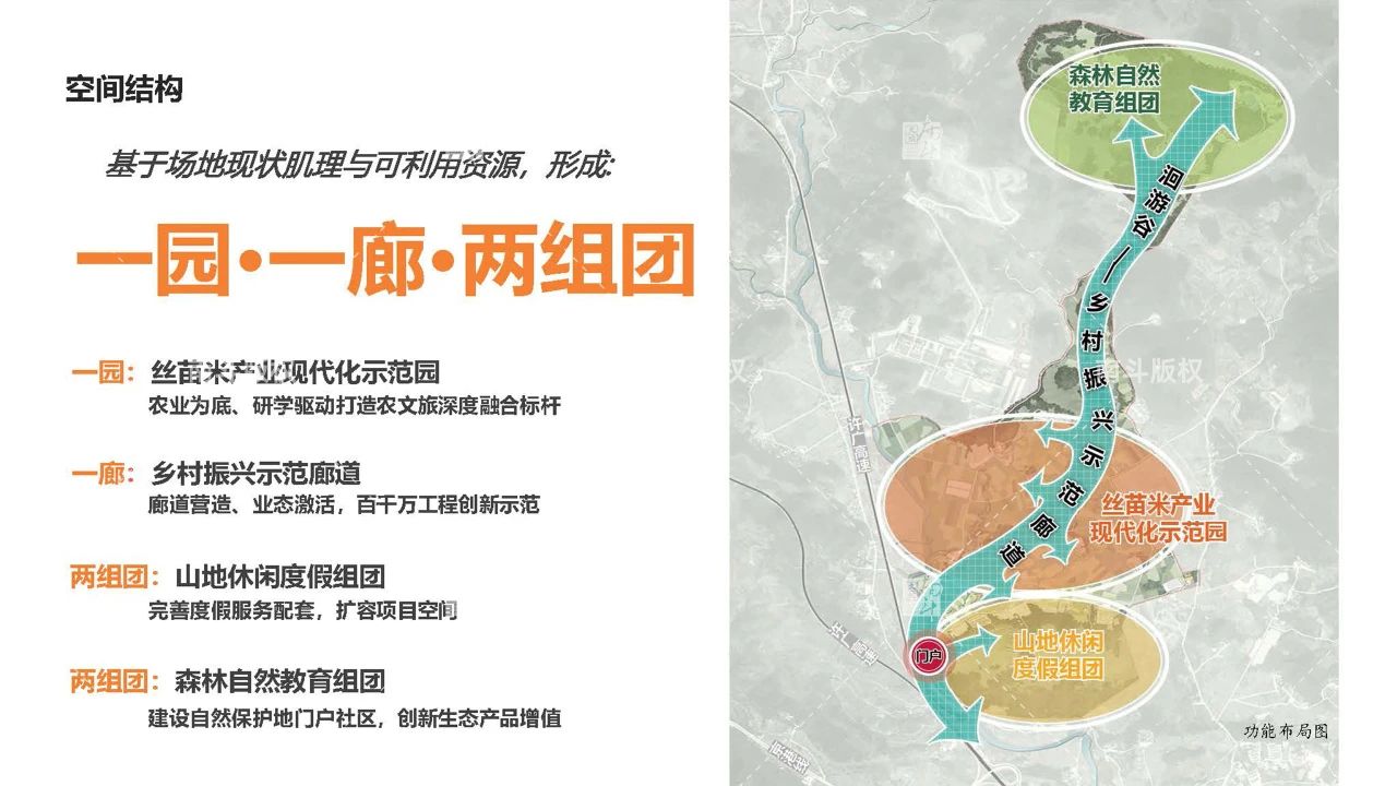 规划形成“一园一廊两组团”的空间格局。中部以农业为底、研学驱动,形成丝苗米产业现代化示范园;中央廊道以河为脉,整合乡村存量资源,打造乡村振兴示范廊道;南部依托山地,完善度假配套,增加立体体验项目,形成山地休闲度假组团;北部紧邻自然保护区,通过发展石漠化科教、营地探险等活动导向型自然教育产业,打造森林自然教育组团,为高质量保护利用提供支撑。