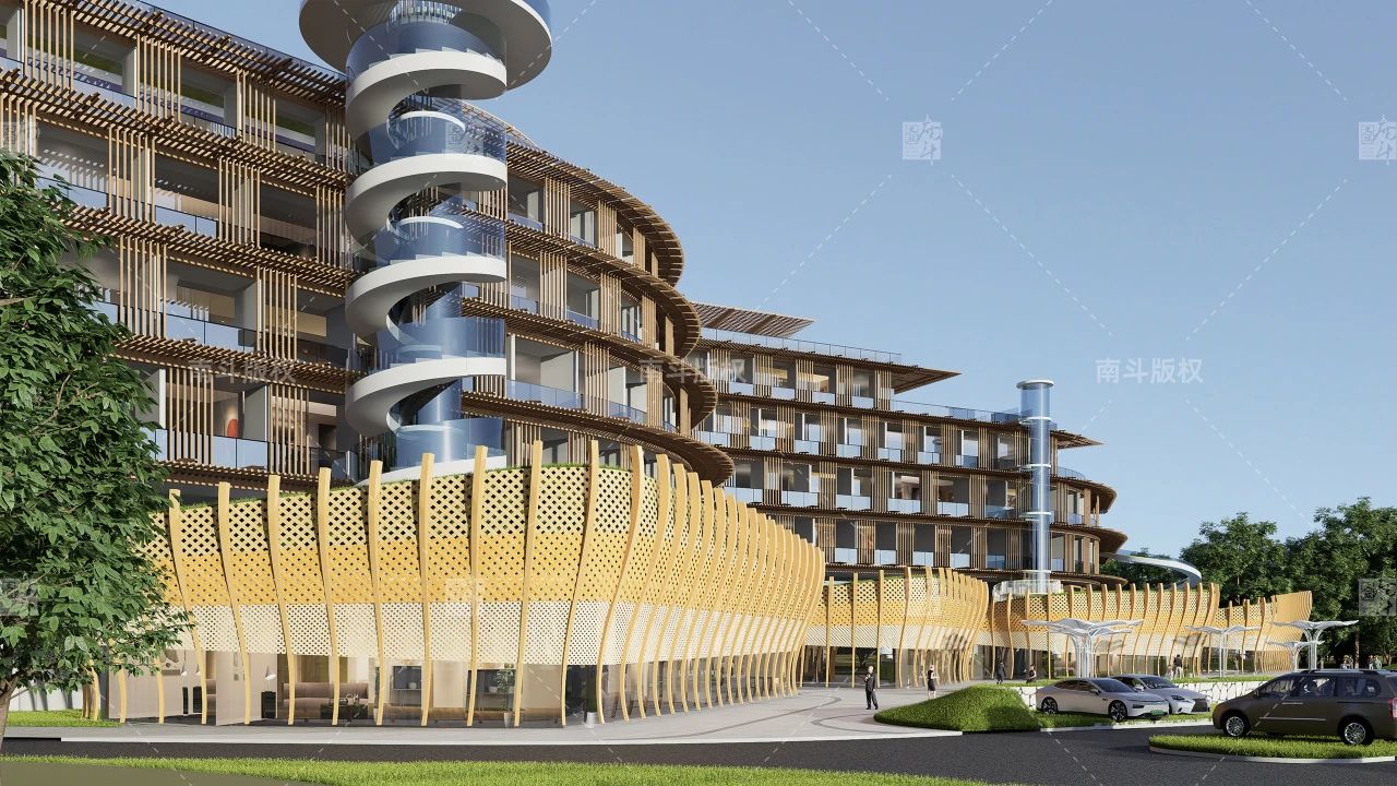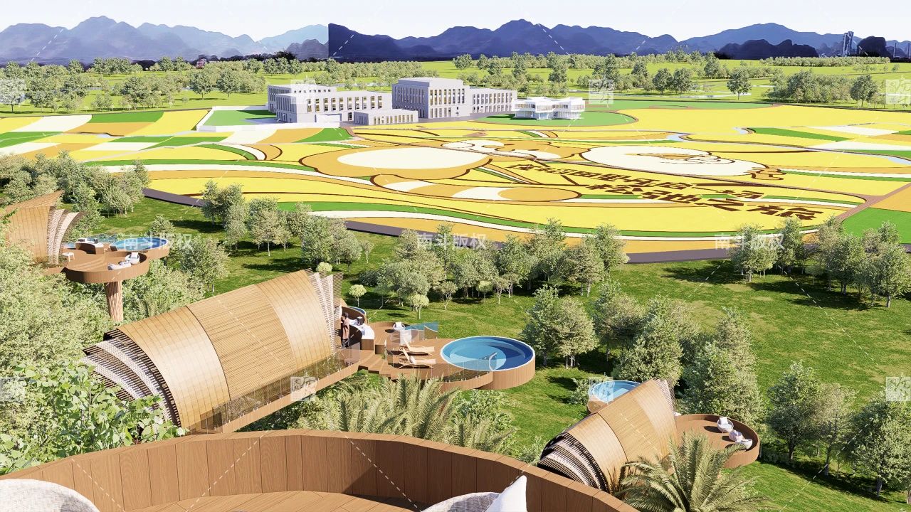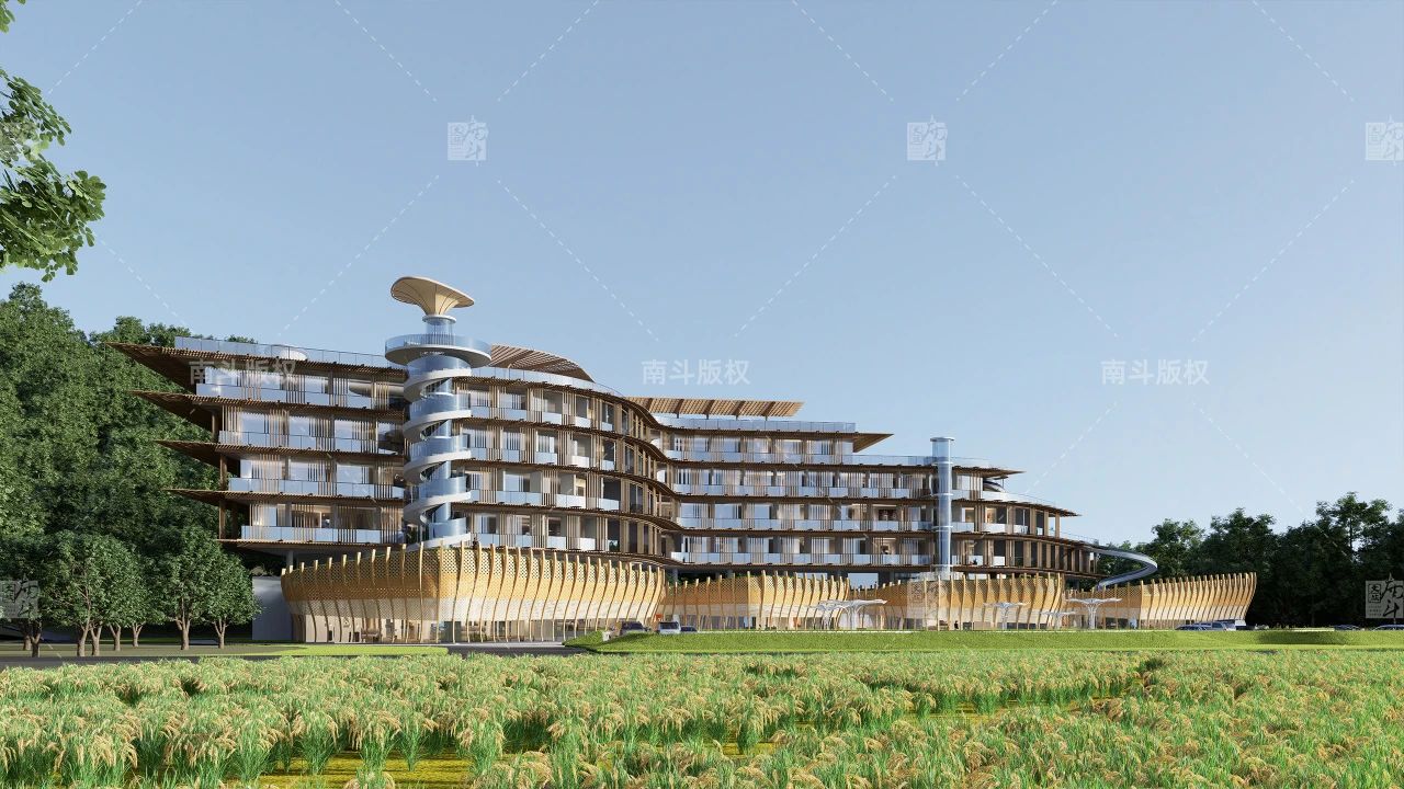 在田园生活板块,规划设计馥野度假酒店,以风吹稻浪轻舞飞扬的建筑形态作为稻田景观的延续,在屋顶和立面之间打造环线式的立体游乐场,孩童如风中稻穗般穿梭于各平台,而成人的看护场景可转化为茶吧、咖啡吧等疗愈空间,实现全龄友好、三代同乐的一站式度假体验。