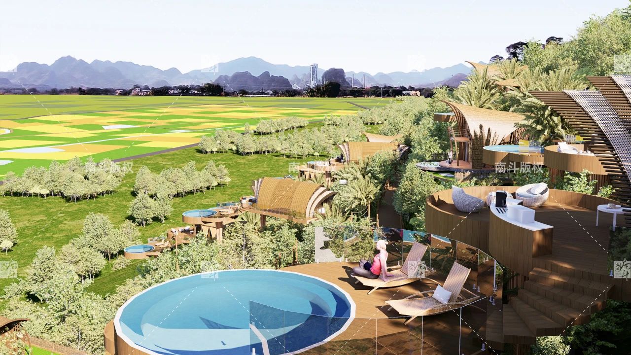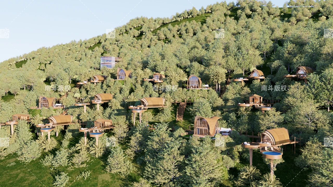 在酒店南侧山坡,拥有项目地最佳的视野空间,规划以"东方竹隐美学"为设计理念,打造国内首个生态原竹度假建筑群落。全手工编制的原竹建筑,通过"传统工艺现代表达-生态技术在地转化-文化遗产活态传承"三位一体模式,响应国家“以竹代塑、以竹代钢”的双碳战略,实现建筑零碳排。传统营造技艺与现代设计语言的融合,构建"建筑隐于山、文化溶于室、体验归于野"的高端度假目的地。