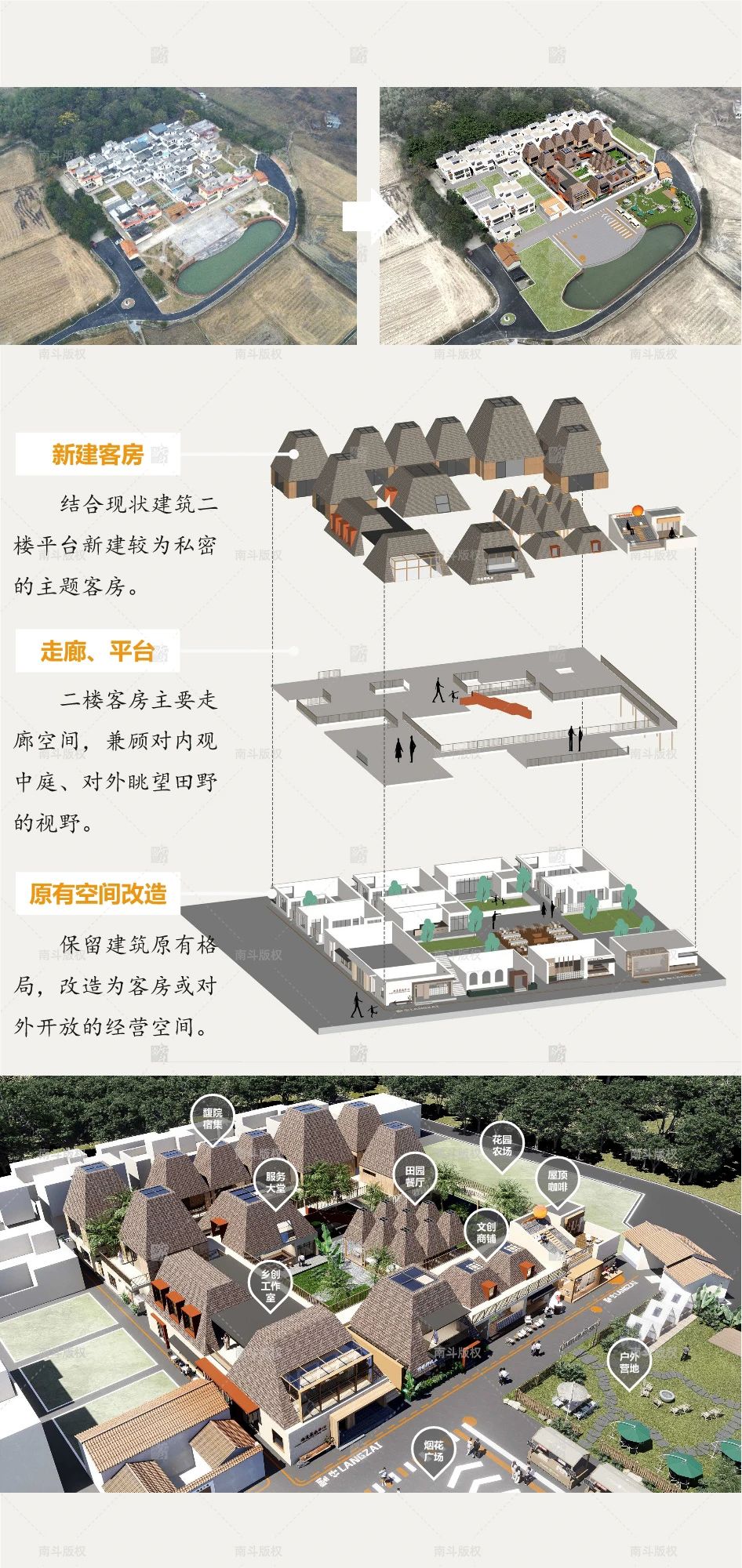 塱仔村,是乡村生活重点示范空间,作为当地空心化自然村落之一,简单的"穿衣戴帽"式整治模式难以为继。规划通过创新性的"小院并大院"对空间重组策略,有机整合零散院落资源,构建起乡村美学与当代生活融合的度假空间形式。同时,通过精准业态植入与功能复合化布局,有效吸引青年创客、文旅企业等振兴主体入驻,真正实现空间赋能乡村振兴的可持续路径。