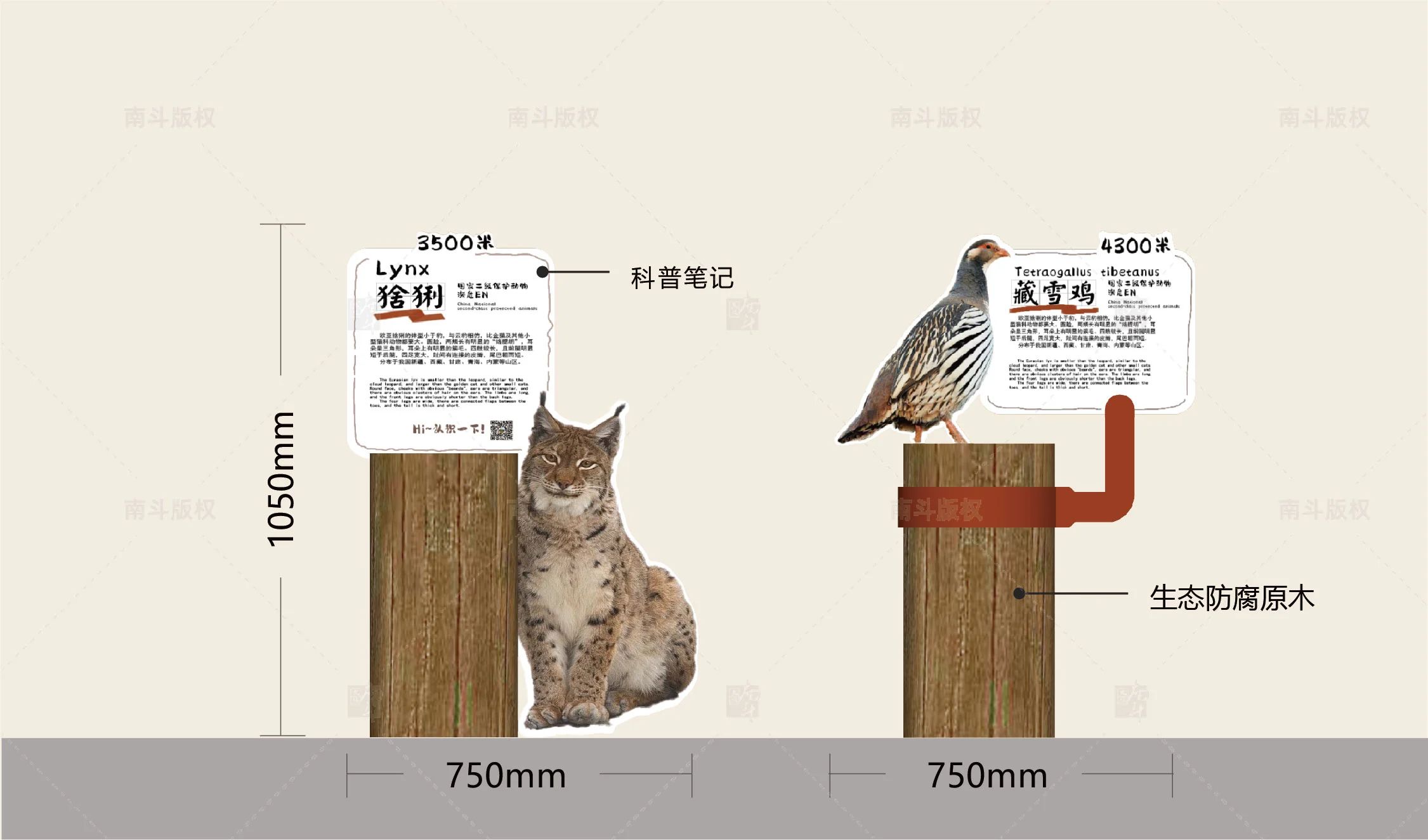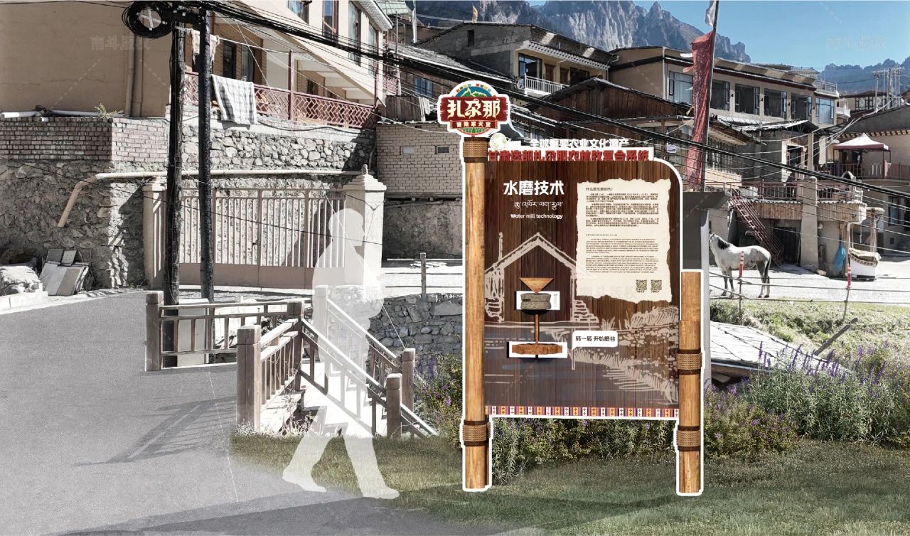 ◉ 科普牌:我们为扎尕那的独特地质景观量身打造了"探险家野外笔记"科普系列——每块原木卡槽式科普牌都如同探险家们的考察笔记,用素描画风记录不同的地科普内容,如藏区独特的水磨技术,搭配立体可互动的水磨装置。当游客转动下方转盘时,会带动上方的水磨转动,让科普变得更有趣味。