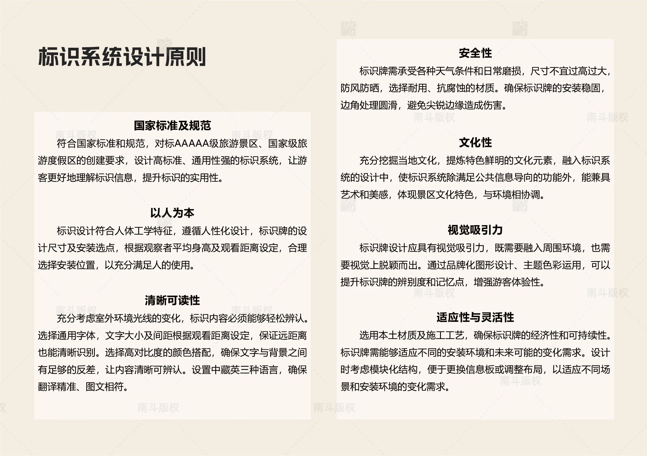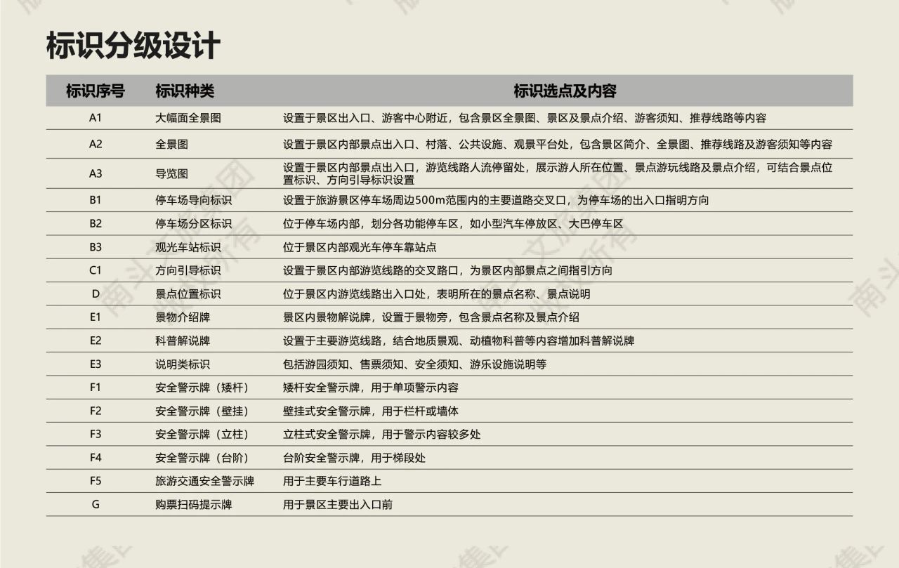 ◉ 设计严格对照《旅游景区质量等级划分》(GB/T 17775-2024)、《旅游度假区等级划分》(GB/T 26358-2022),实现标识系统的“全覆盖、易识别、强引导”。