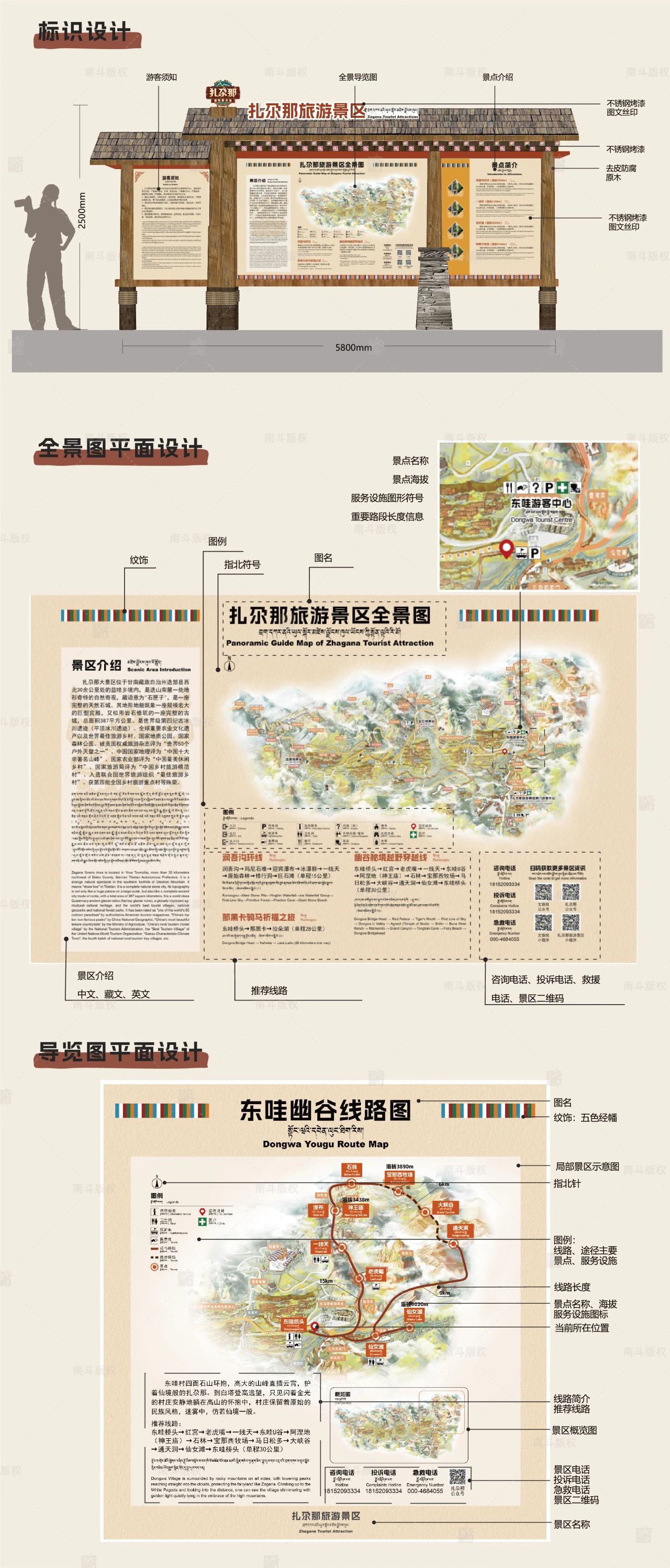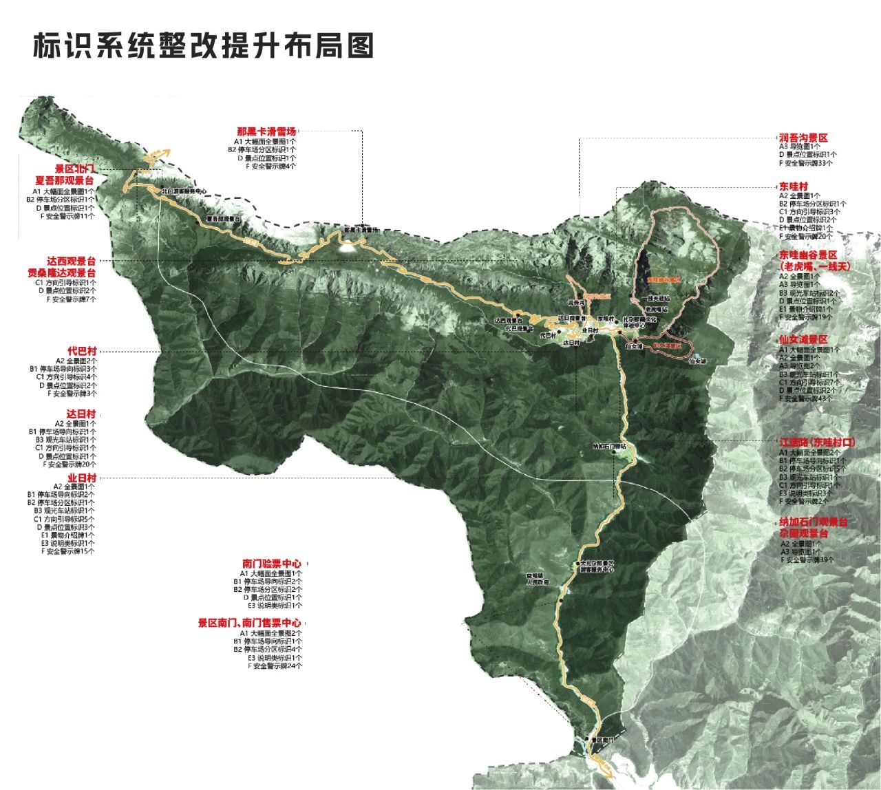 项目组通过在扎尕那景区北门-南门江迭公路50km沿线,以及仙女滩、一线天核心游览区,东哇村、业日村、达日村、代巴村四个特色藏寨的深入调研,为扎尕那景区标识系统全面提升形成了选址明确、指引清晰的布局方案,包括《标识系统整改提升方案》(涵盖15类标识系统类型、明确340个标识选点),《旅游交通导向牌、扫码购票提示牌布局方案》(明确49个标识选点),《旅游交通安全警示牌》(明确53个标识选点)。