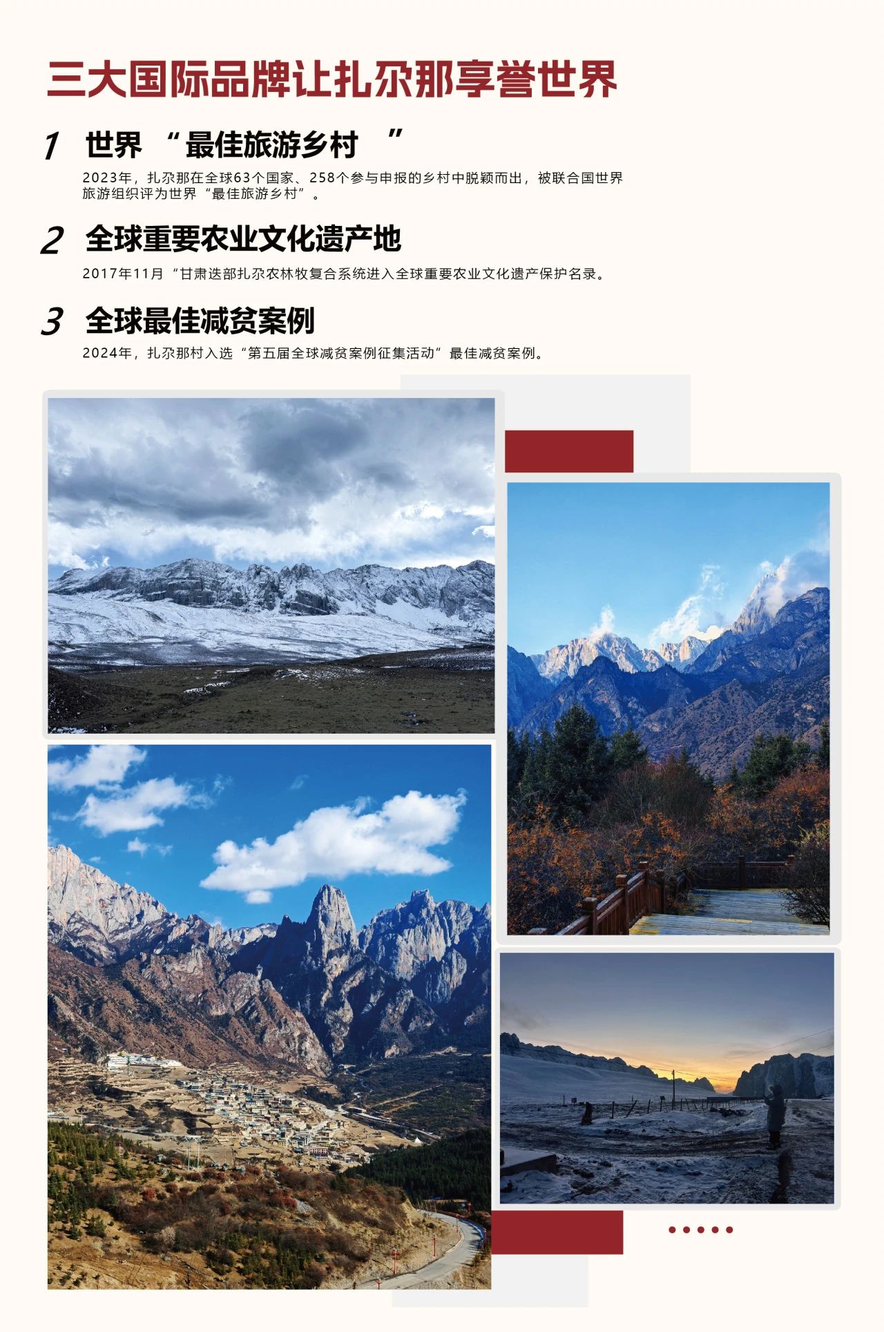 扎尕那(藏语意为“石匣子”),是位于中国甘肃省甘南藏族自治州迭部县西北部的一处天然石城,被誉为“东方伊甸园,神秘香巴拉”。2018年4月,扎尕那农林牧复合系统被联合国粮农组织评为全球重要农业文化遗产地。在扎尕那海拔3500米以上地段,保存着古冰川地貌山峰60余座,在强烈的融冻侵蚀作用下形成峰林、峰丛地貌、刃脊、U形谷、峡谷、冰蚀谷以及裂陷谷等保存完好的冰川遗迹,是名副其实的“世界级冰川遗迹博物馆”。因此也为扎尕那旅游贡献了“迭山横雪”“日照金山”“九天石门“等具有独特壮美的标志性地理景观,吸引着无数旅游者前来打卡。