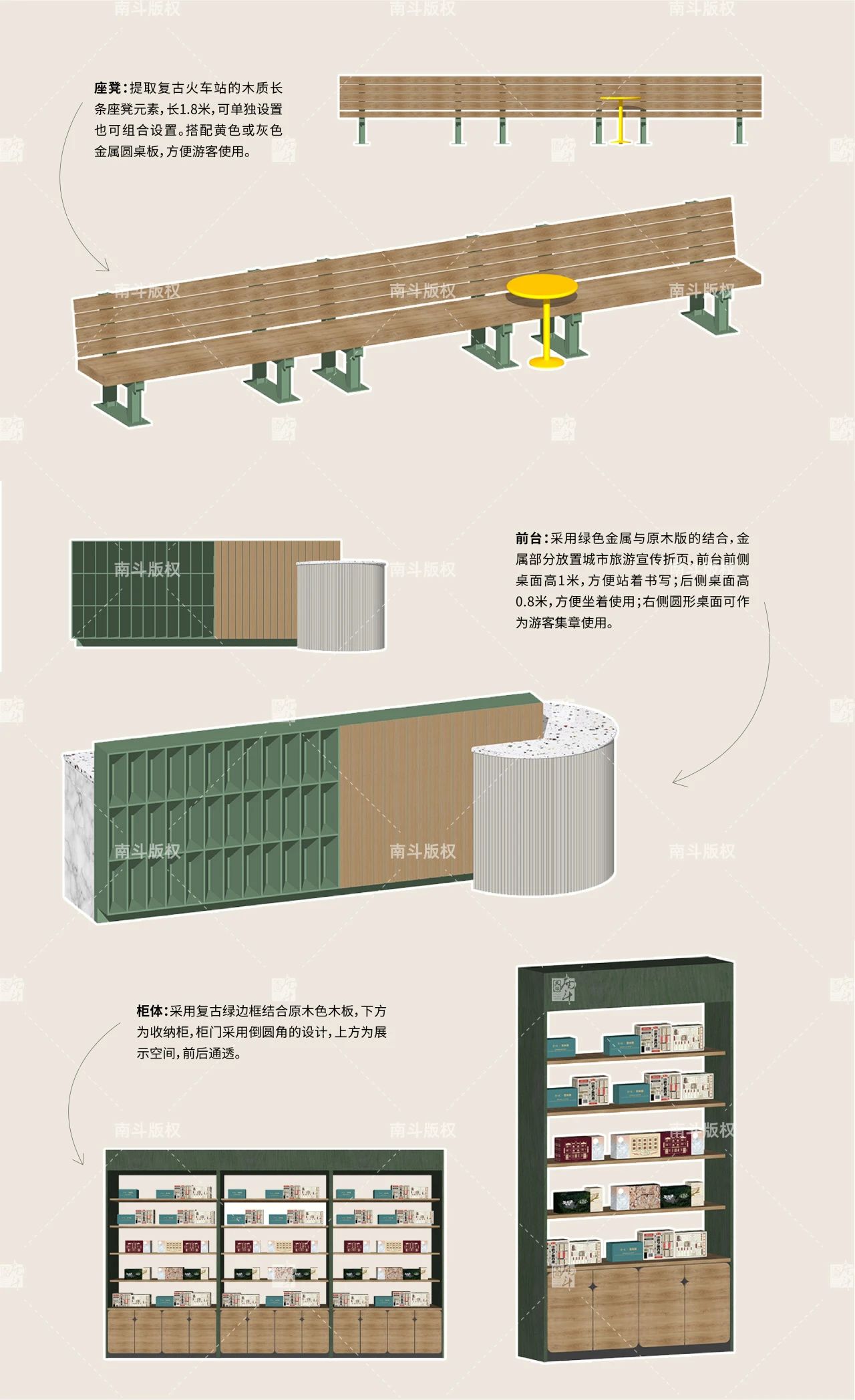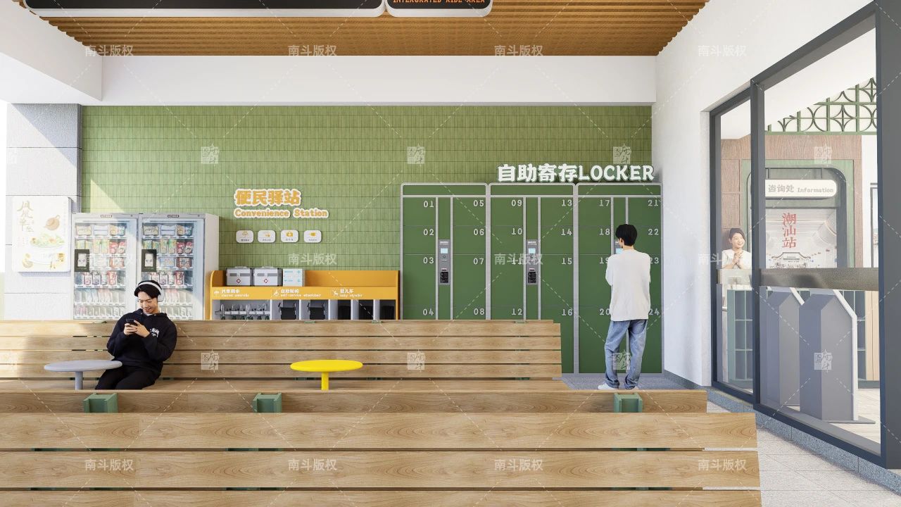 整体设计风格以复古火车站为主题,设置原木条形凳,增加主题化导览设计。拆除候车区与服务中心的实体墙,将单面展陈升级为双面展示,增强空间互动性与视觉通透感。靠墙增设自动寄存柜、雨伞及婴儿车租赁等服务设施,提升候车舒适性与功能性。