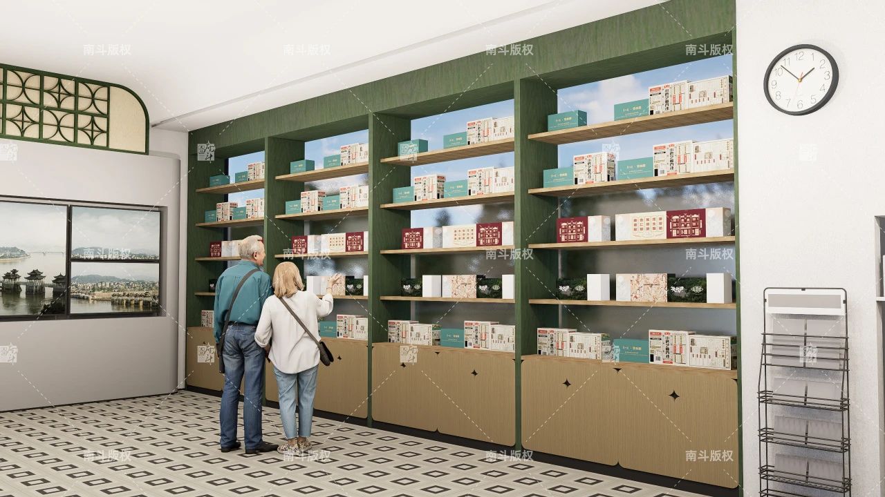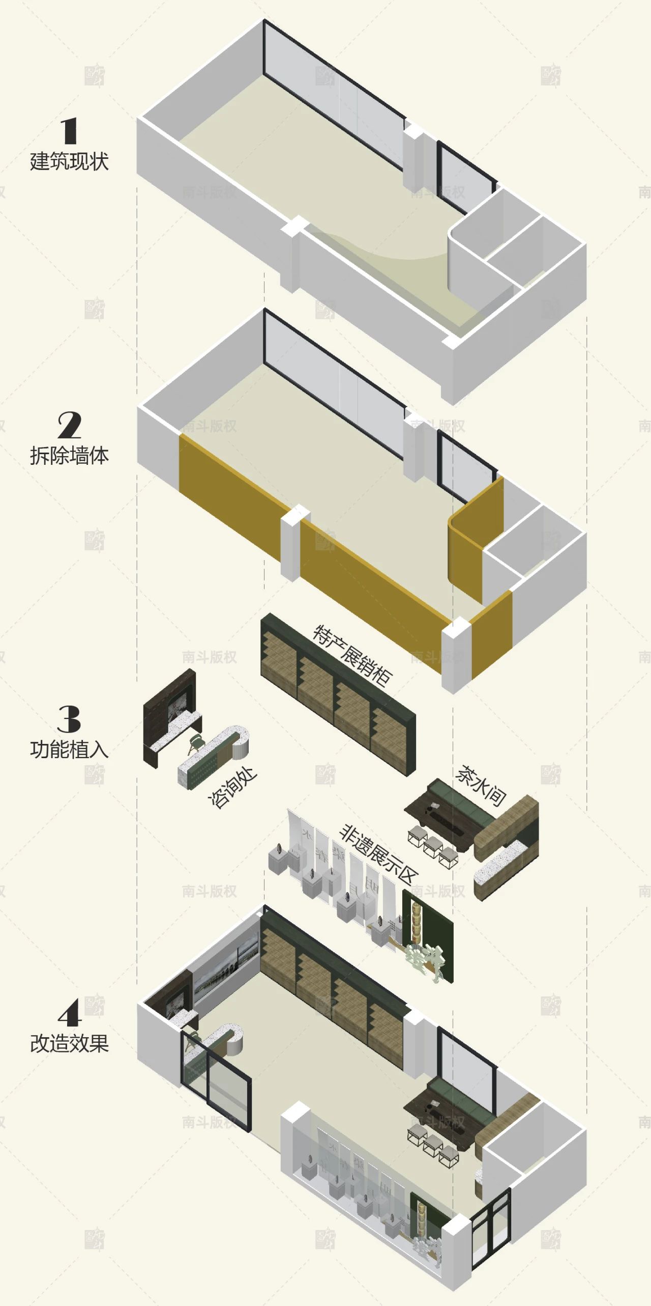 保留现状玻璃门窗,增设无隔断展柜设计,既保留了建筑原有采光,又作为潮汕特色产品展区,展示庵埠糖果、凤凰单丛等潮汕代表性特产。