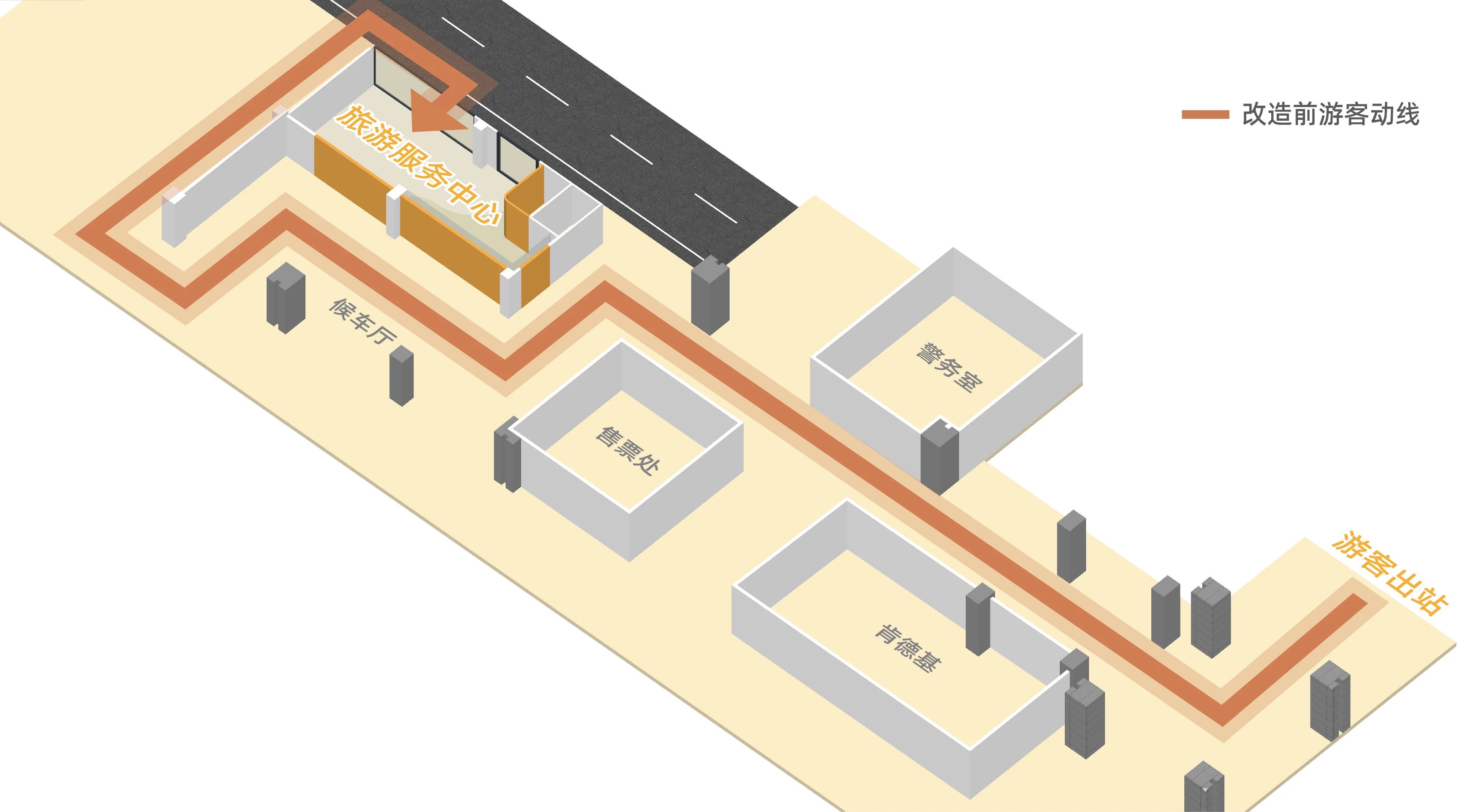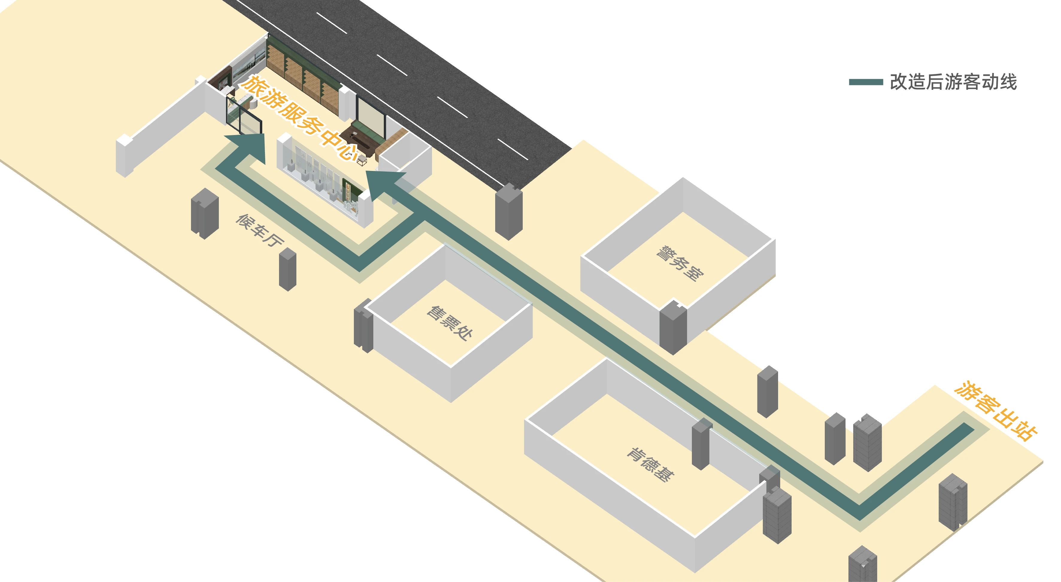 封闭原建筑入口,在次通道尽头新设门洞,使游客出站后沿主、次通道直达室内,避免绕行,提升可达性。
