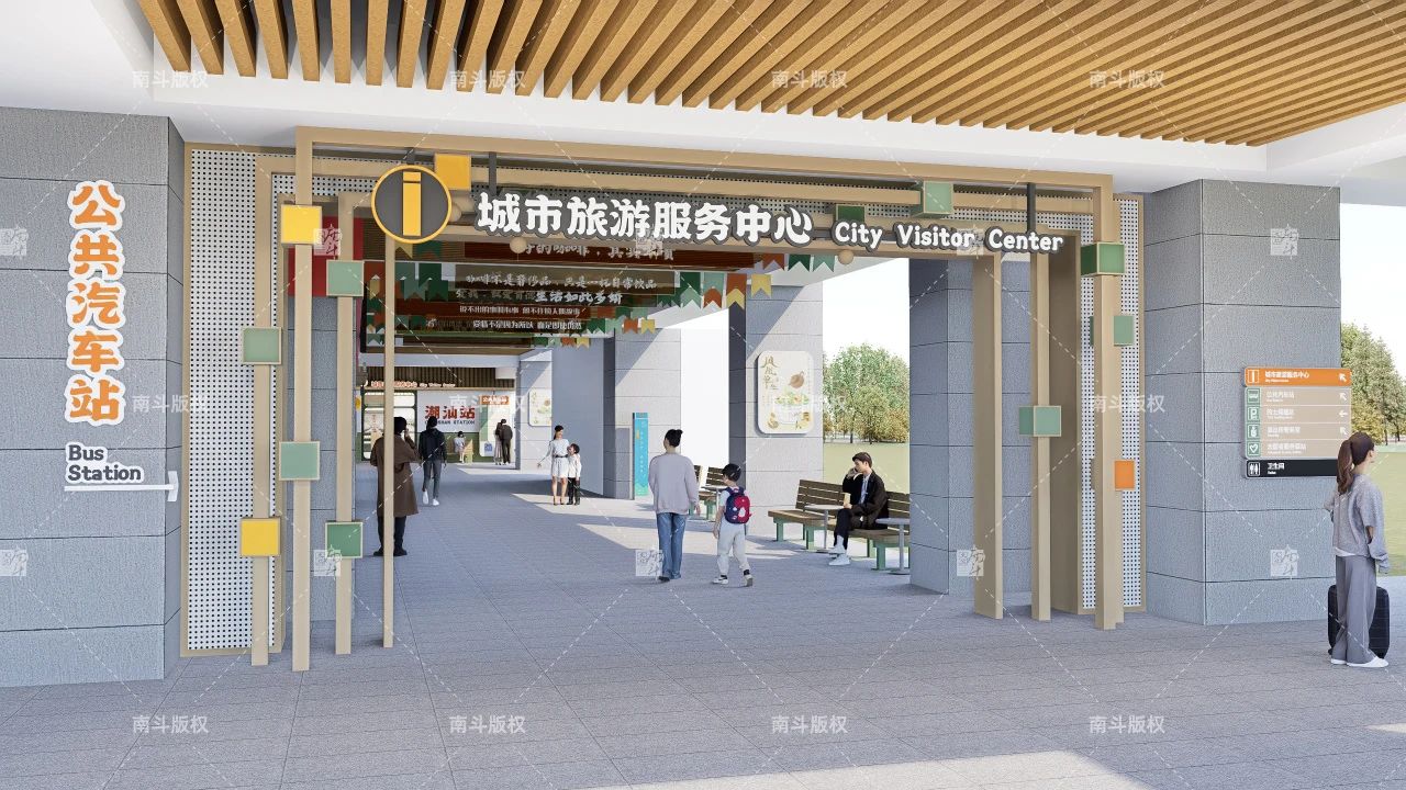 将次通道纳入旅游服务中心管理范围,前置门户,设置“城市旅游服务中心”入口标识。沿线布置宣传旗帜、广告灯箱及休闲座凳,为游客提供特产展示与短暂休憩功能的过渡空间。于次通道尽头开设旅游服务中心新门洞,门口增加主题打卡装置。